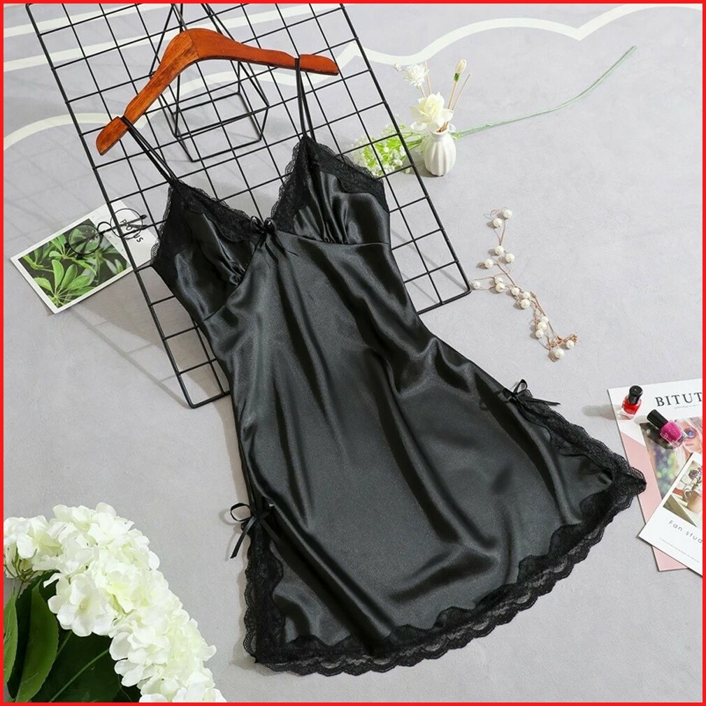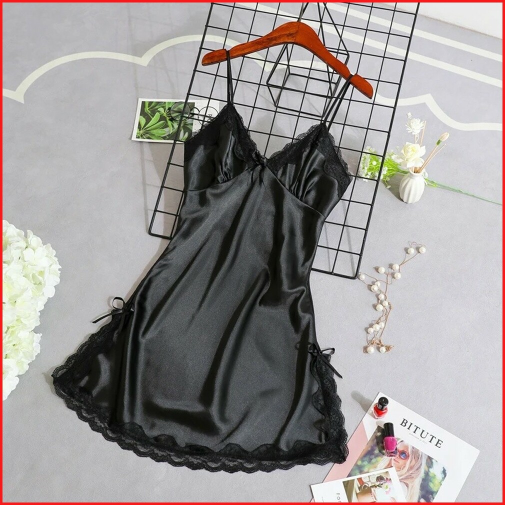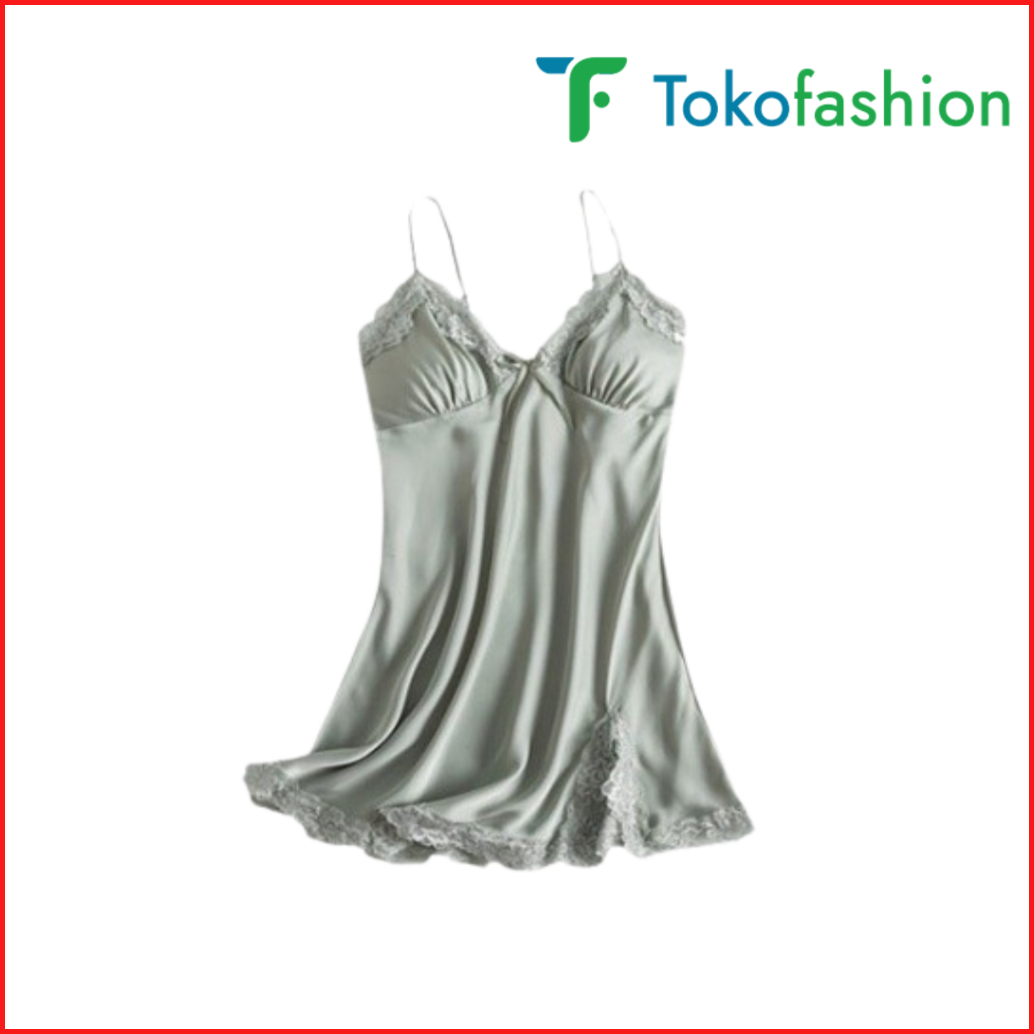Tokofashion Baju Tidur Lingerie Wanita Gaun Mini Deep V Silk Renda Bahan Satin Bt003