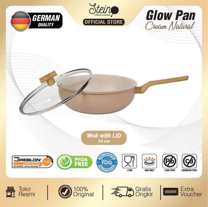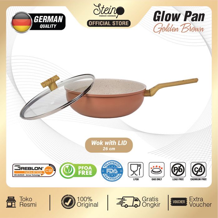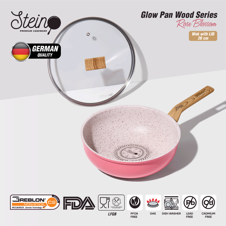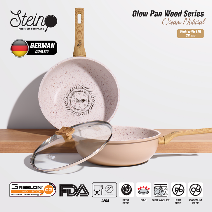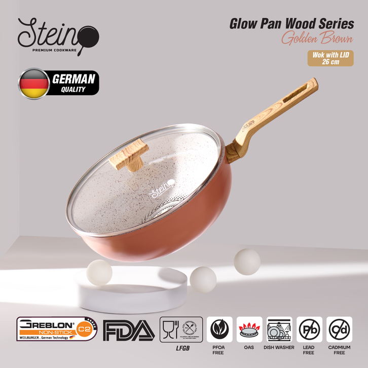 STEIN Glowpan Wok 26cm Wood Handle with Lid - Panci Satuan Lapisan Marbel + Tutup
