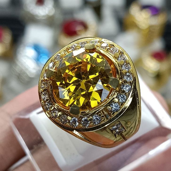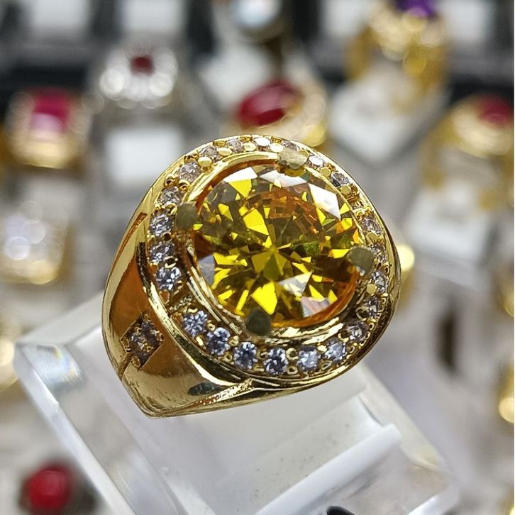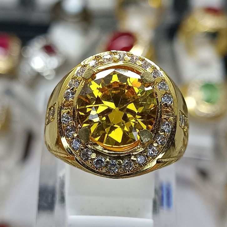 Cin cin Pria Permata Yellow Citrine Round Cut Brilliant Ring Microset Gld - Silver Elegan Mewah