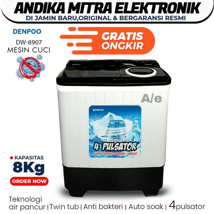 MESIN CUCI 2 TABUNG 8 KG DENPOO DW 8907B 4 PULSATOR