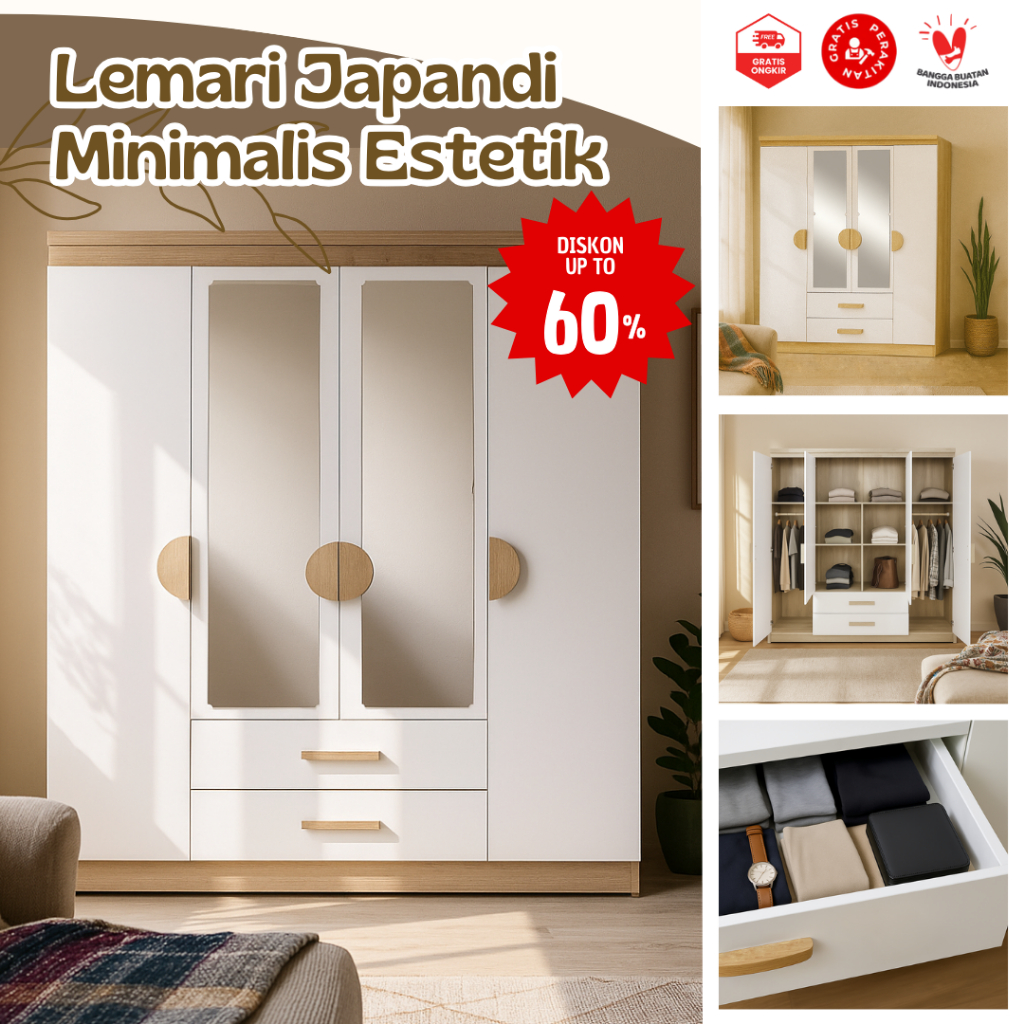 Oak 4 pintu, putih polos 4 pintu reguler, hitam putih 3 pintu reguler, putih laci 3 pintu reguler, Sliding Rotan 4 pintu sliding
