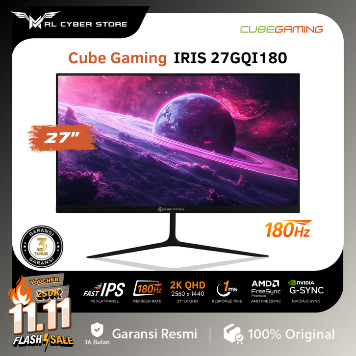 CUBE GAMING IRIS 27GQI180 27" QHD 2K IPS Frameless 180Hz Gaming Monitor with G-SYNC / Monitor 27 inch