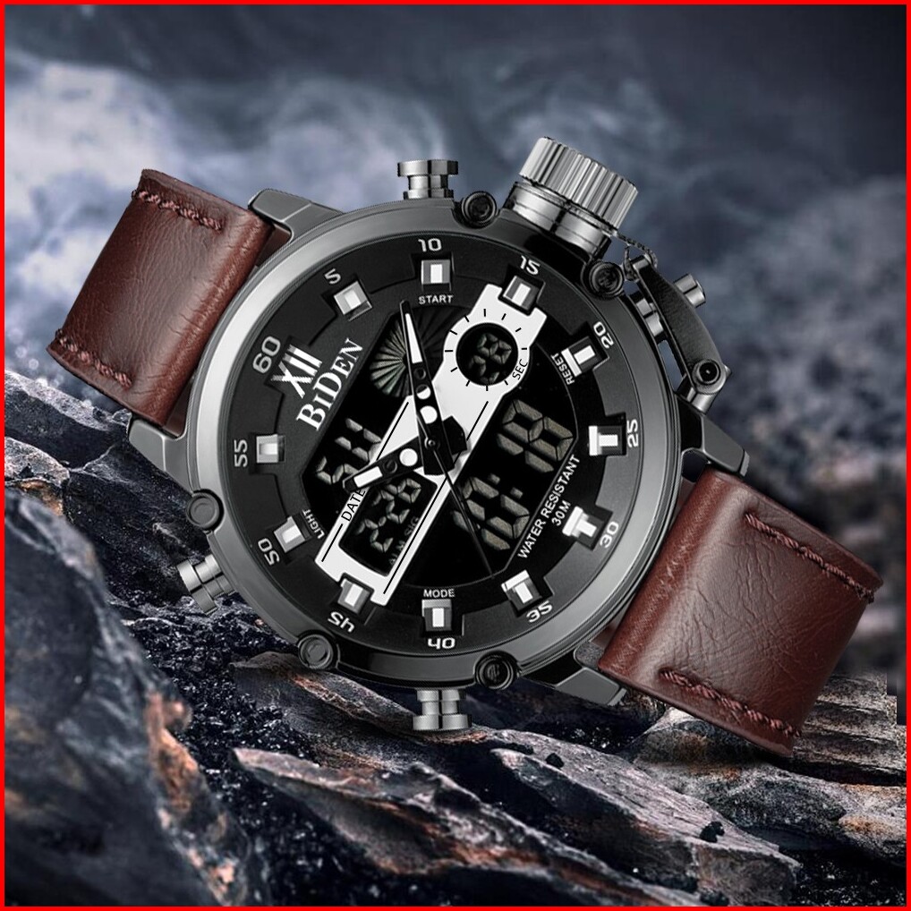 Biden Jam Tangan Pria Olahraga Militer Analog Digital Tali Tali Kulit Anti Air Kuarsa Jam Tangan Cowok Original