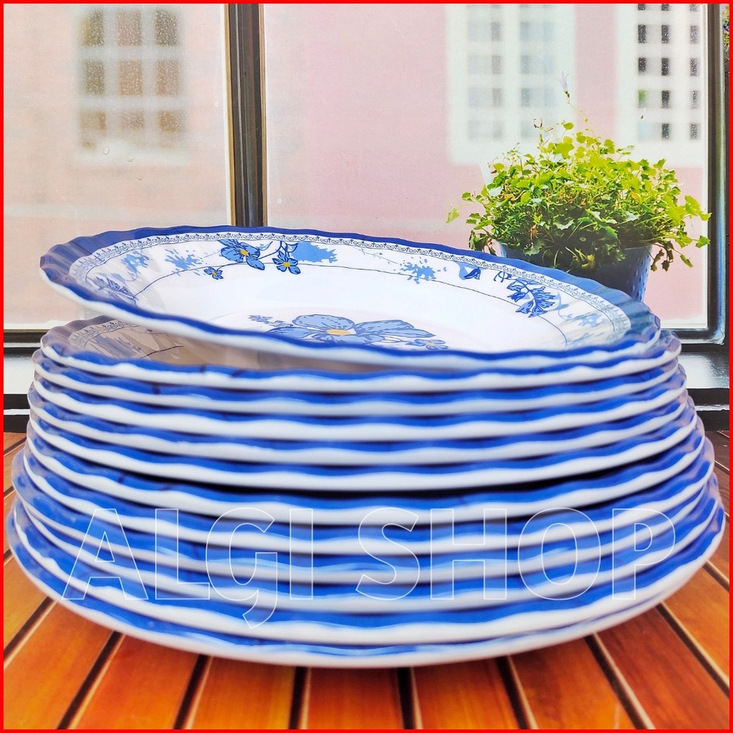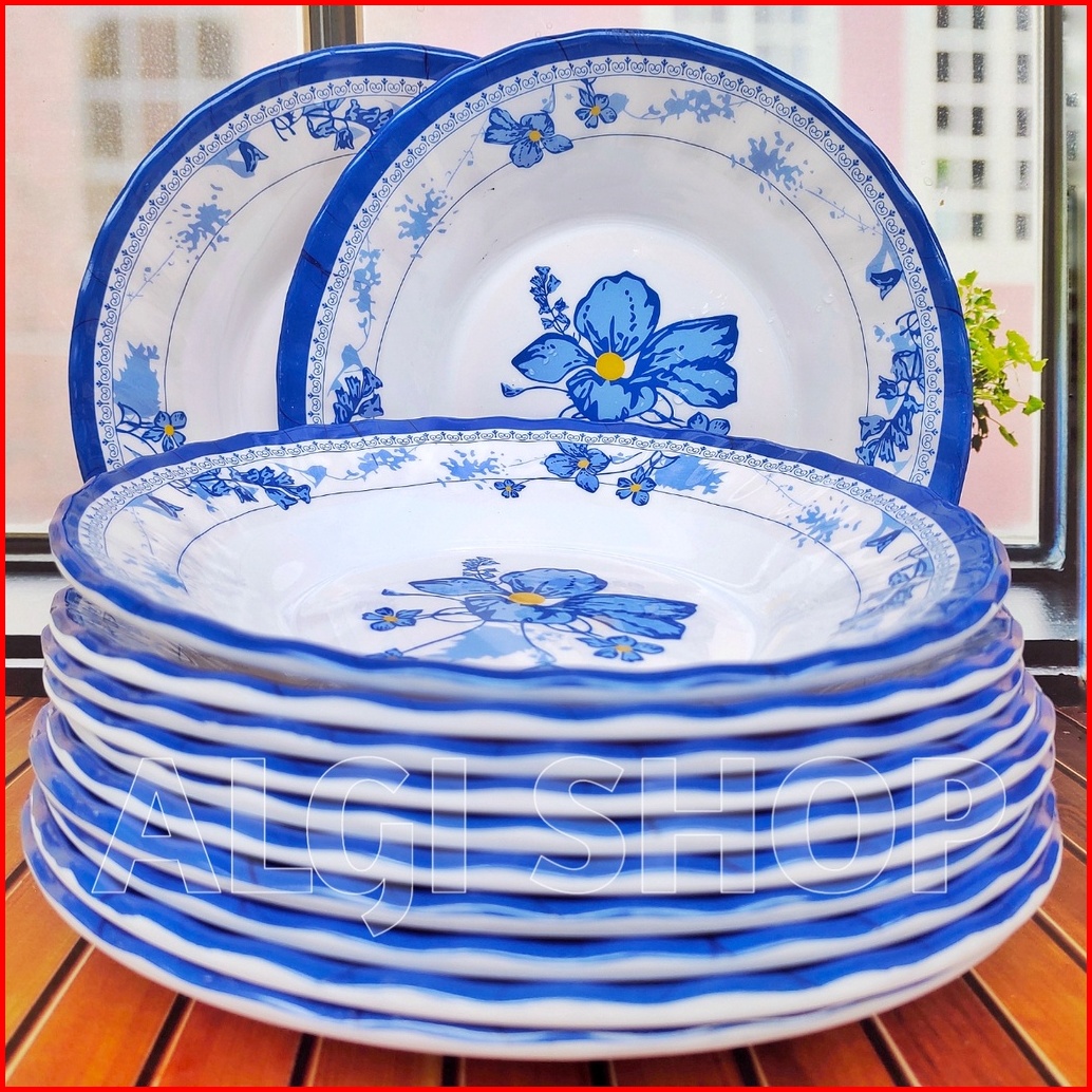 12pcs Piring Melamine Bear 21cm Motif Kembang Biru