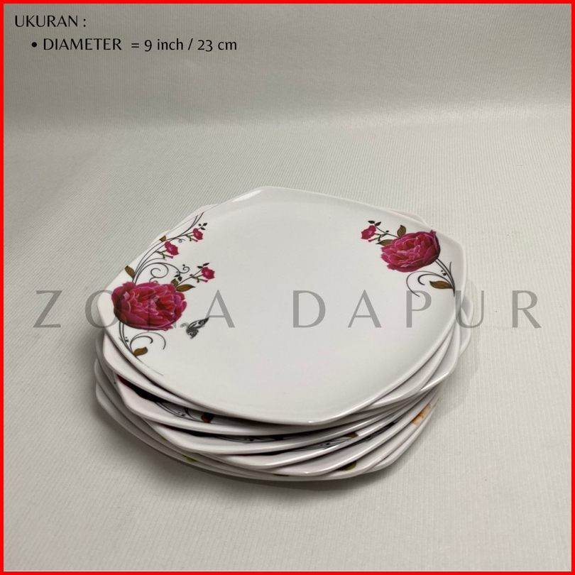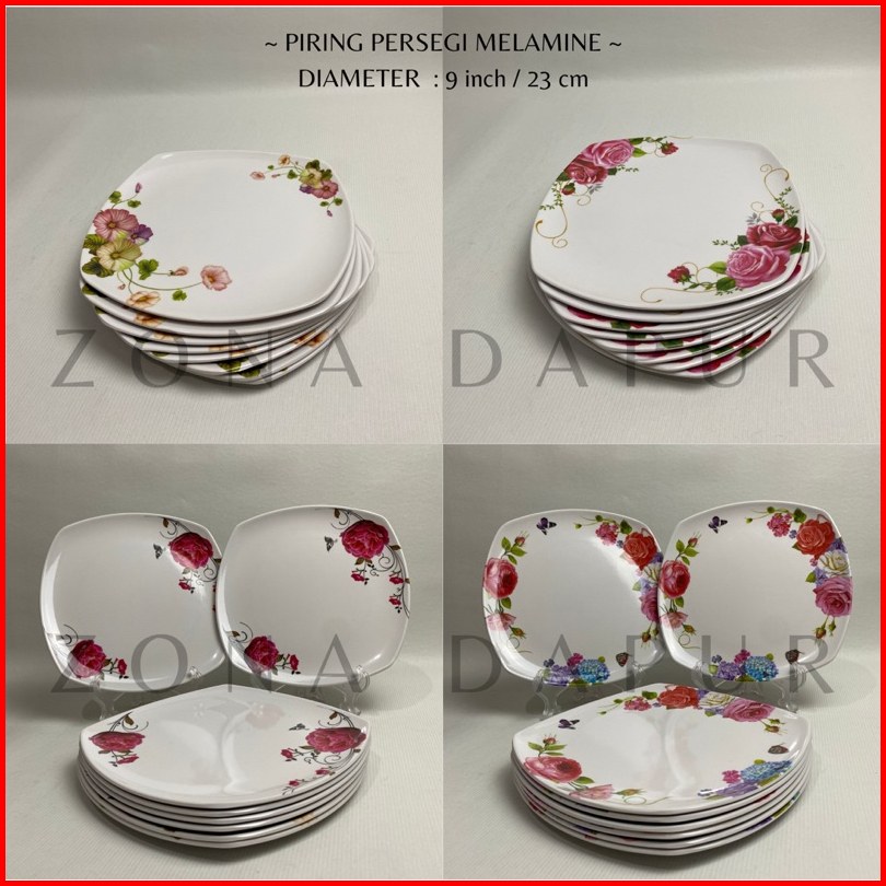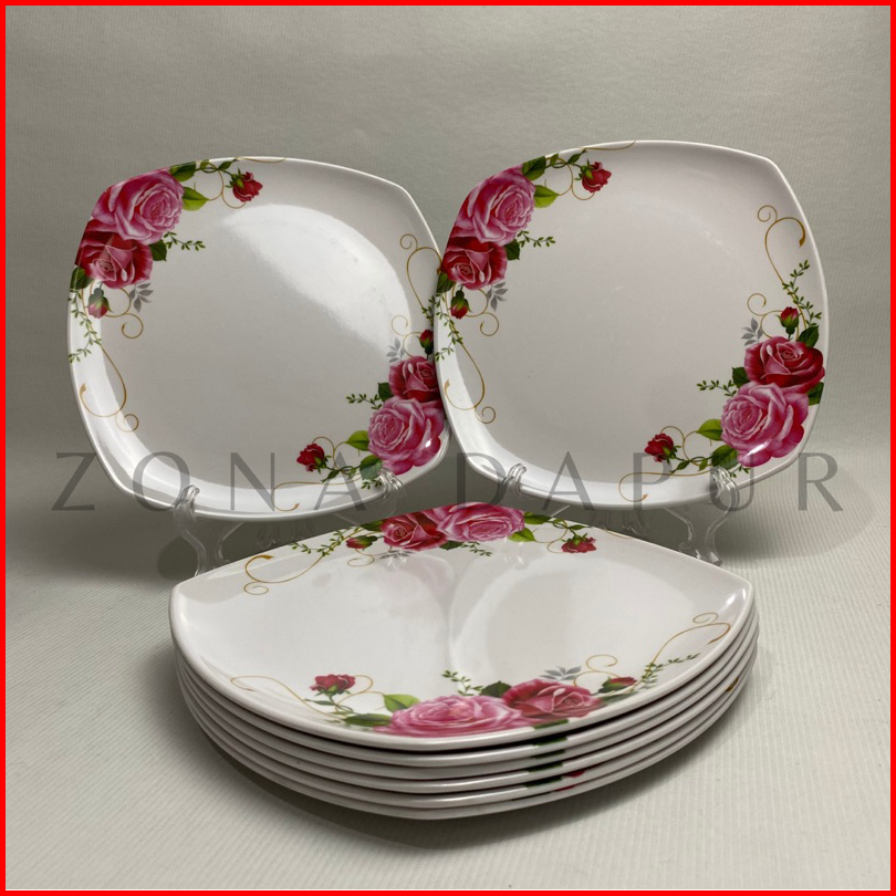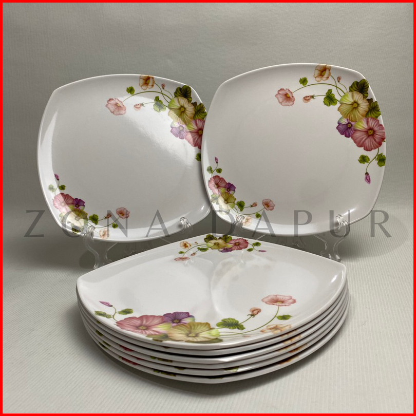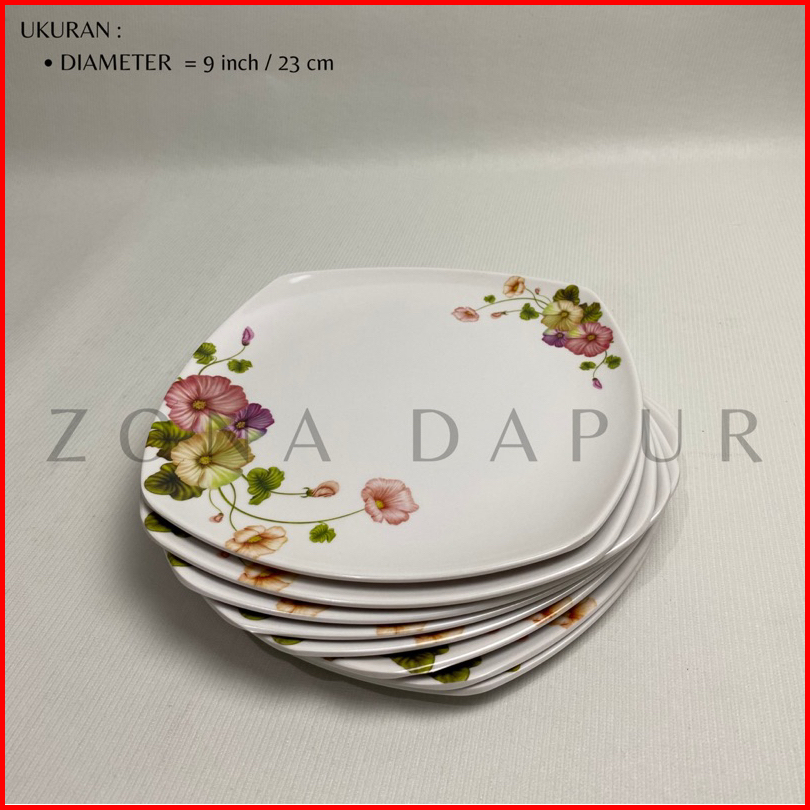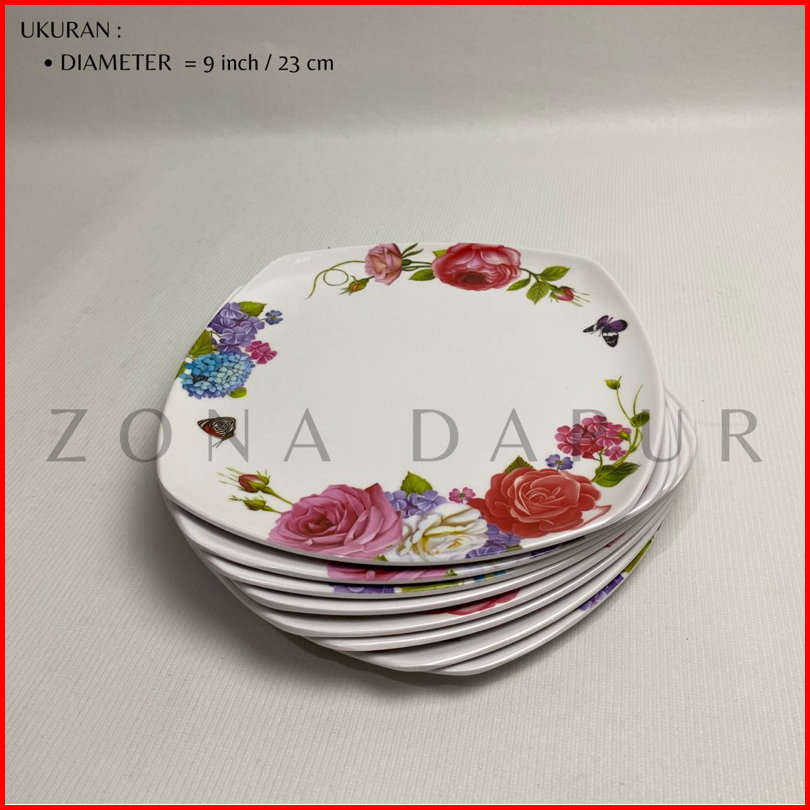 6 Pcs - Piring Makan Persegi Ceper Melamin 9 Inch Motif Bunga Singasingi - Piring Saji Melamine