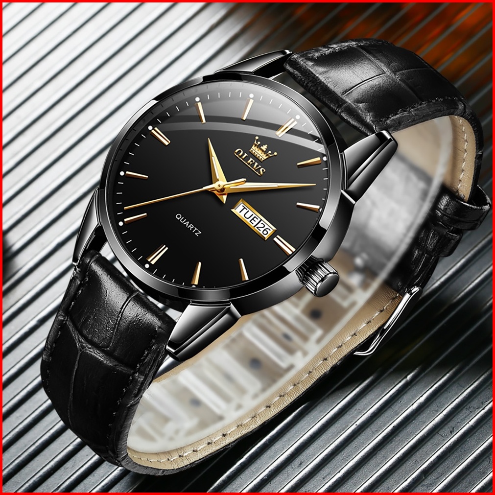 Olevs Jam Tangan Pria Original Anti Air Tahan Kulit Analog Men Watch Hitam Putih Biru