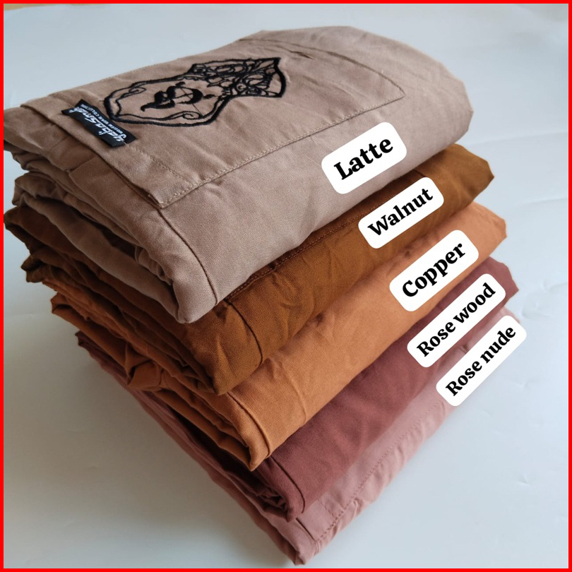 Hitam, Putih, Maroon, Tosca, Birel, Hijau qubah, Ungu abu, Navy, Coklat mocca, Pink, Army, Hijau lumut, Lavender, Matcha, Wardah, Abu, Latte, Manggis, Sage Green, Cream, Putih tangan biasa, Hijau botol, Coklat nisma, Abu tua, Caramell, Avocado (new), Mint, Denim, Plum (new), Rose wood, Blewah, Shalu maroon, Lilac, RANDOM, Rose nude, Mustard, Turky nyoklat, Bata, Coklat tua, Syakira pink, Syakira ungu, Bench Hitam, Terompah putih, Terompah hitam, Tajj hitam, Tajj putih, Bunga burgundy, Bunga putih, Nael putih, Nael latte