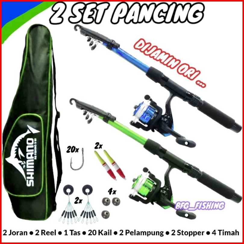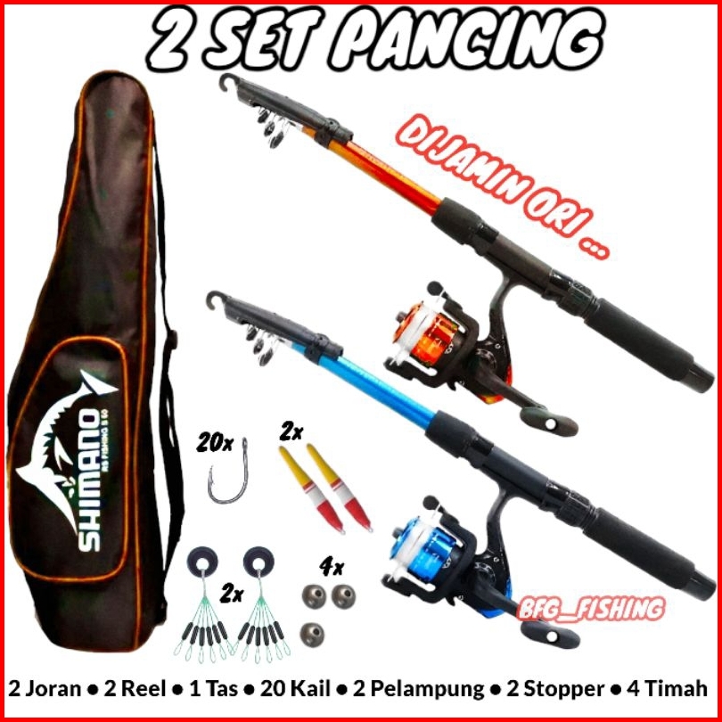 2 Set Joran 150cm Dan Reel Pancing Biru Merah Plus Tas Bonus Kail Stopper Pelampung Timah