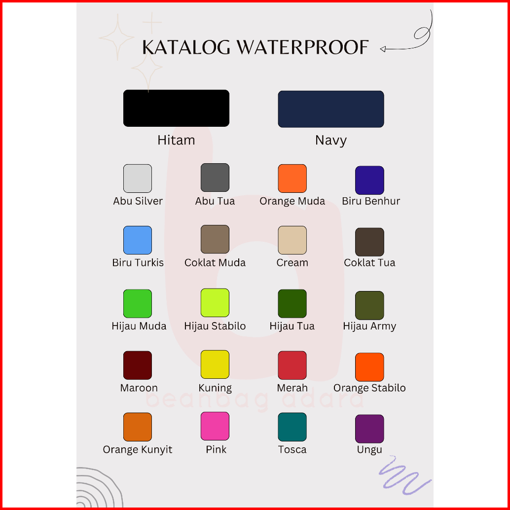 Purin, Kuromi, Lotso, Monstera Hitam, Mazepink, Black Curve, Grey Curve, Monstera Navy, Love Mitch, Moonstar, Polkadot Pink, Triangular Coklat, Tividi Blue, Dark Falma, Dark Green, Light Green, Prisma, Stripe Grey, Stripe Mocca, Grey Swan, Pink Swan, Tividi, Triangular Navy, Zigzag Orange, Plaid Grey, Zebra, Leaf Green, Rainbow, Black Prismatic, Flamingo Waterproof, Maya Waterproof, Monstera Waterproof, Iris Waterproof, Palm Waterproof, Tropical Waterproof, UK Waterproof, Vesperi Waterproof, Porta Waterproof, Batik Waterproof, Waterproof Polos