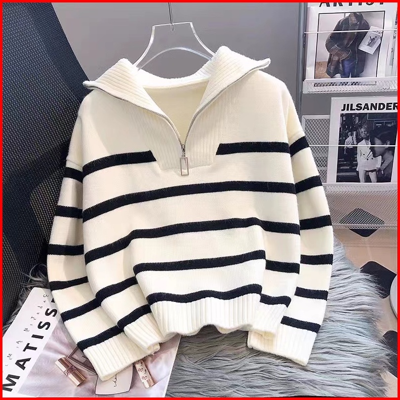 Monica Sweater Stripe Classy Zipper Rajut Wol Santai V-neck Polos Bunga Setrip Hitam Putih