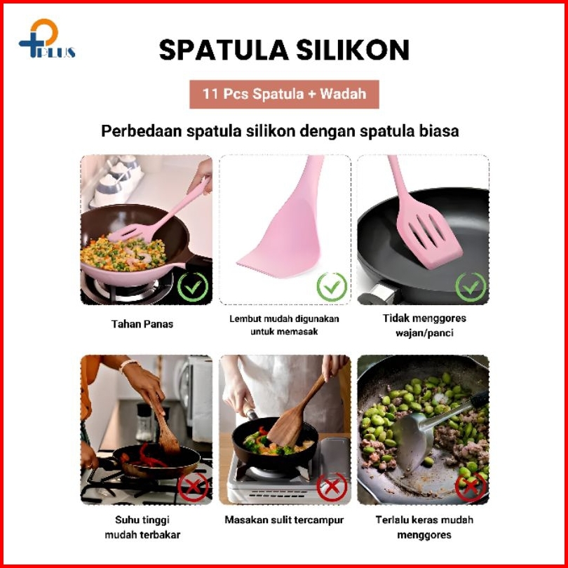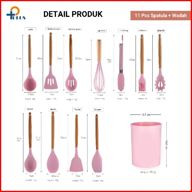 Pplus Spatula Silicone Set 11pcs Wadah Spatula Peralatan Masak Sutil Pegangan Kayu Baking Set Alat Masak 11 Pcs