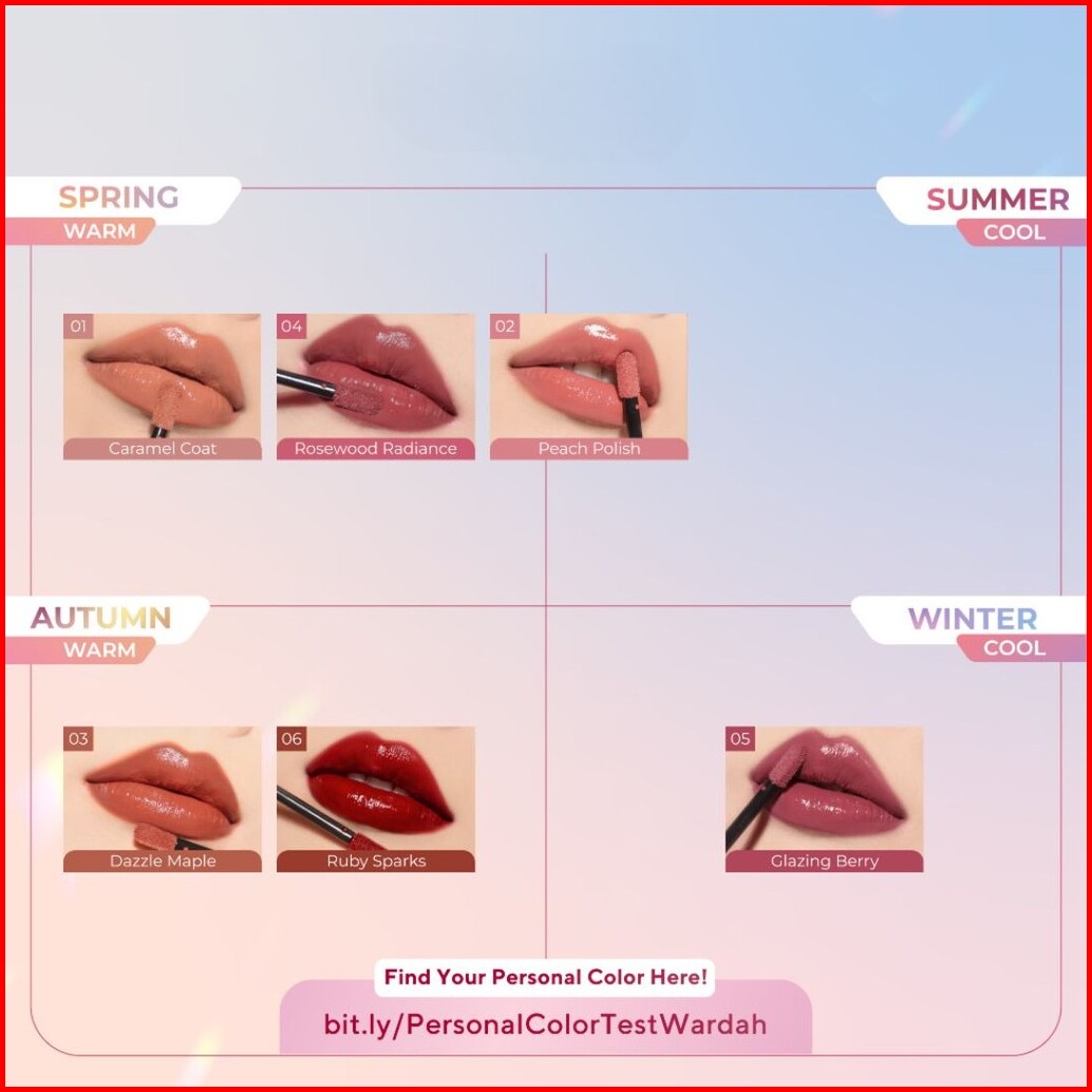 01 Caramel Coat, 02 Peach Polish, 03 Dazzle Maple, 04 Rosewood Radiance, 05 Glazing Berry, 06 Ruby Sparks, 07. Rouge Flare, 08.Plush Pome, 09. Fudgy Toffee, 10. Ombre Sheen, 11. Petal Blush, 12. Shine Sorbet, 13. Pumpkin Drip, 14. Latte Lacquer, 15. Blossom Veil
