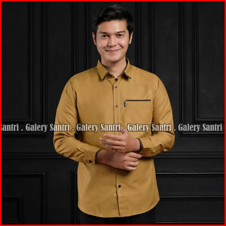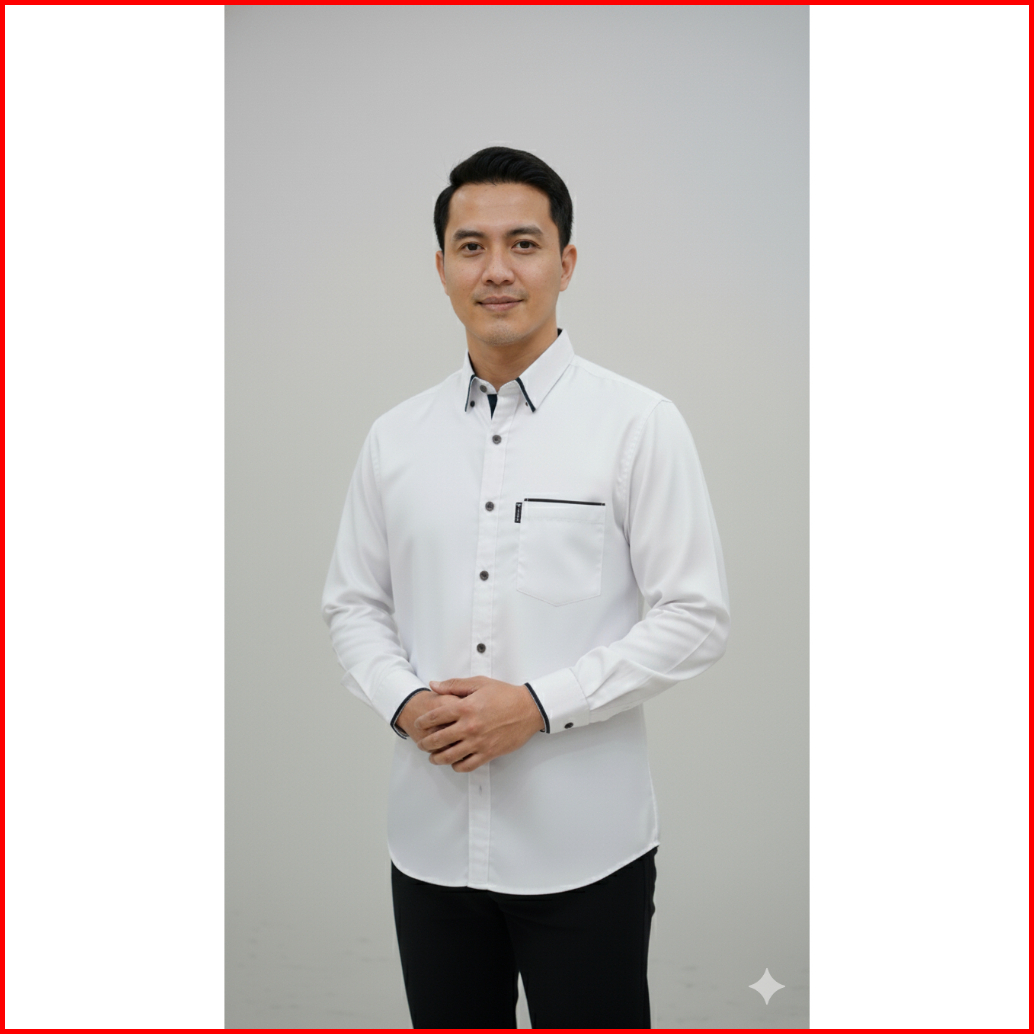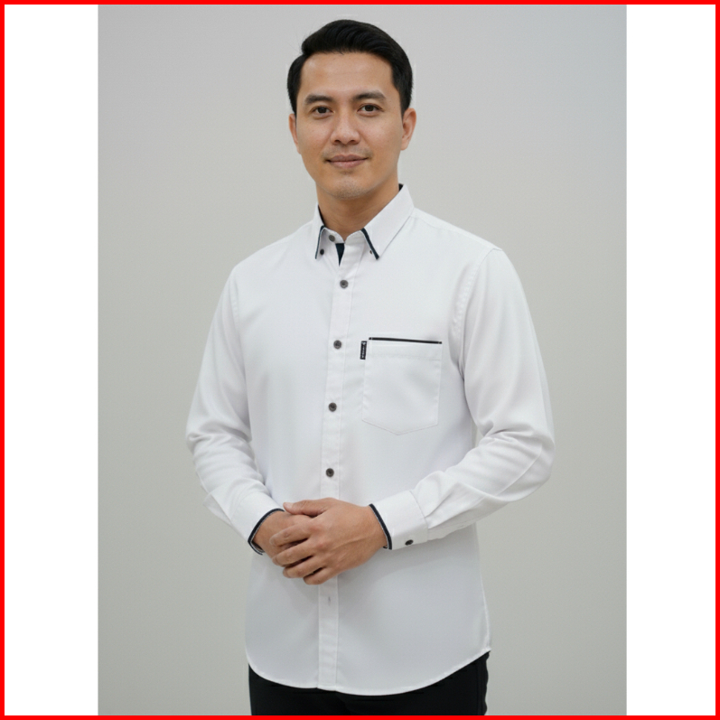 Baju Kemeja Pria Legan Panjang Warna Putih Kerah V Kombinasi Lis Warna Hitam