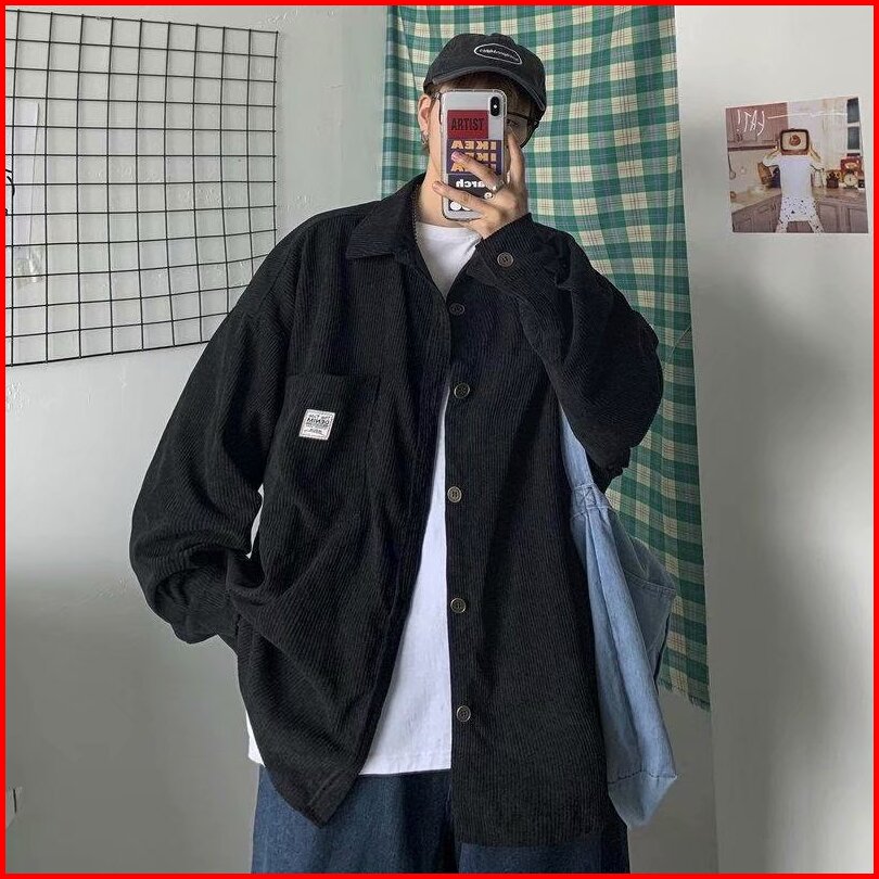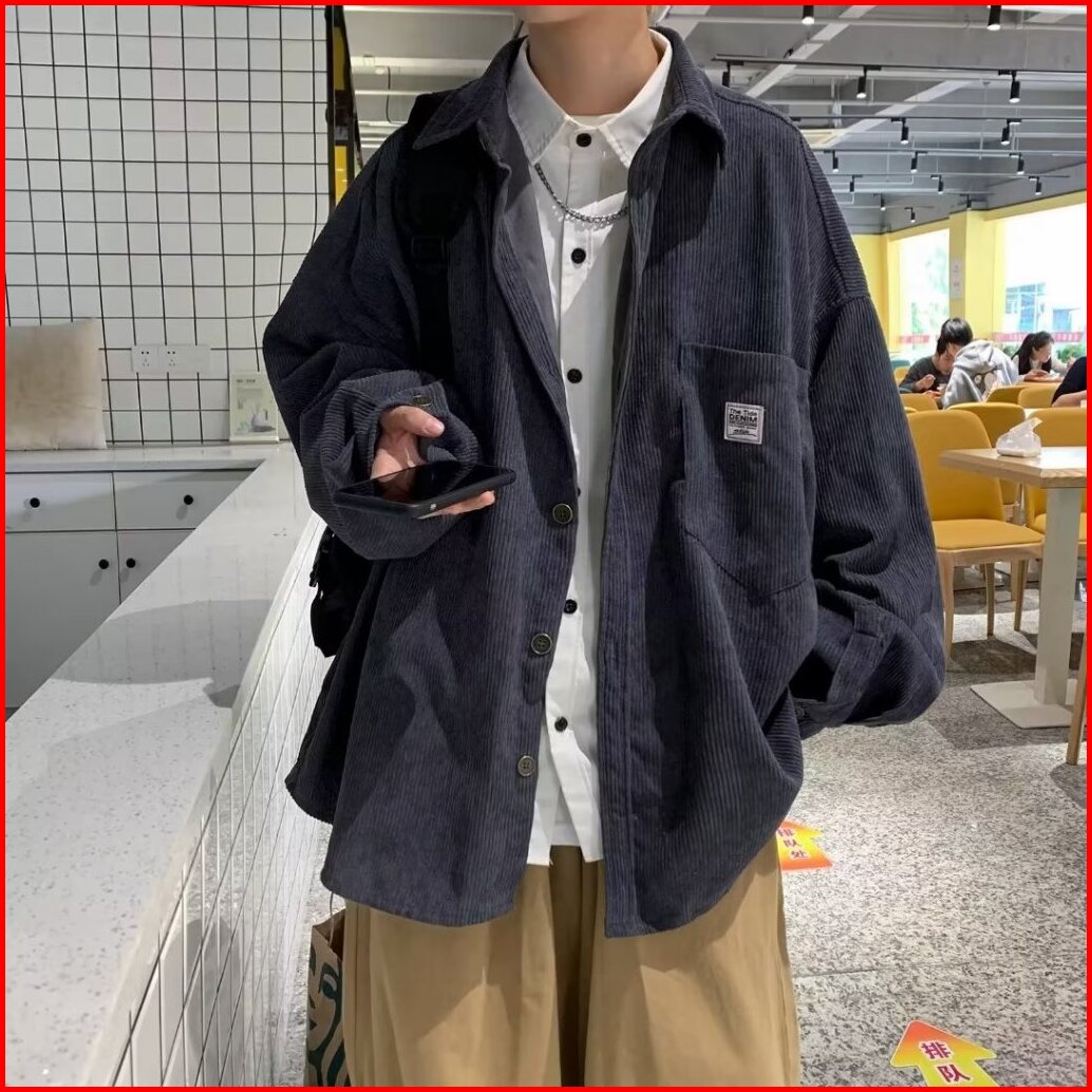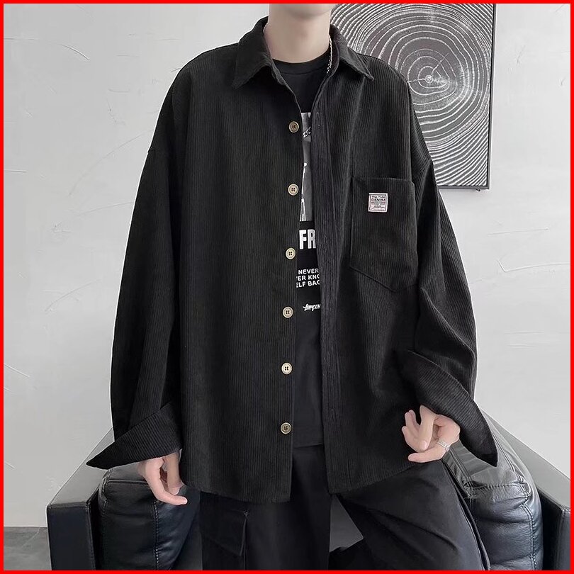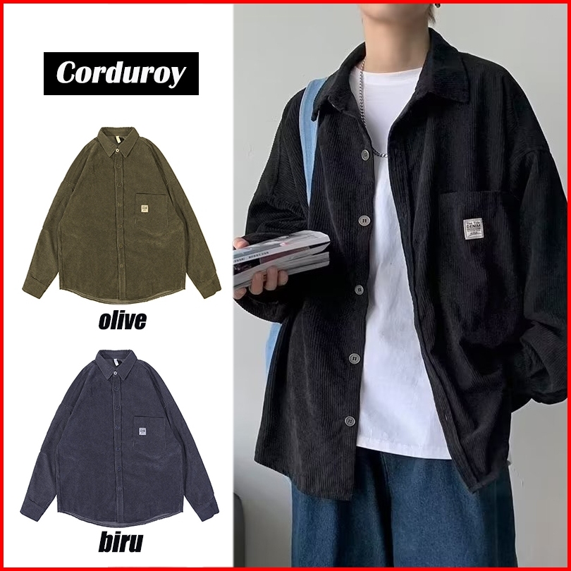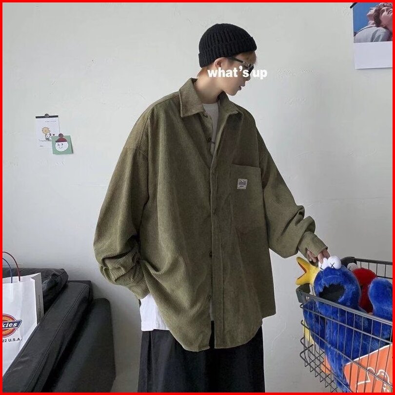 Dark Icon Corduroy Kemeja Pria Lengan Panjang Plain Oversize Shirts Men Korean Outerwear 90s Outfit Baju Pria Hijau Abu-