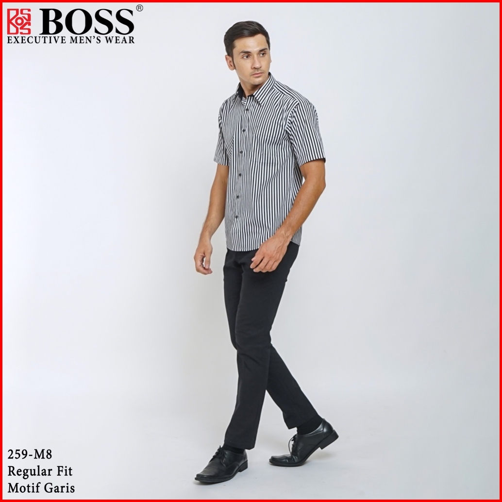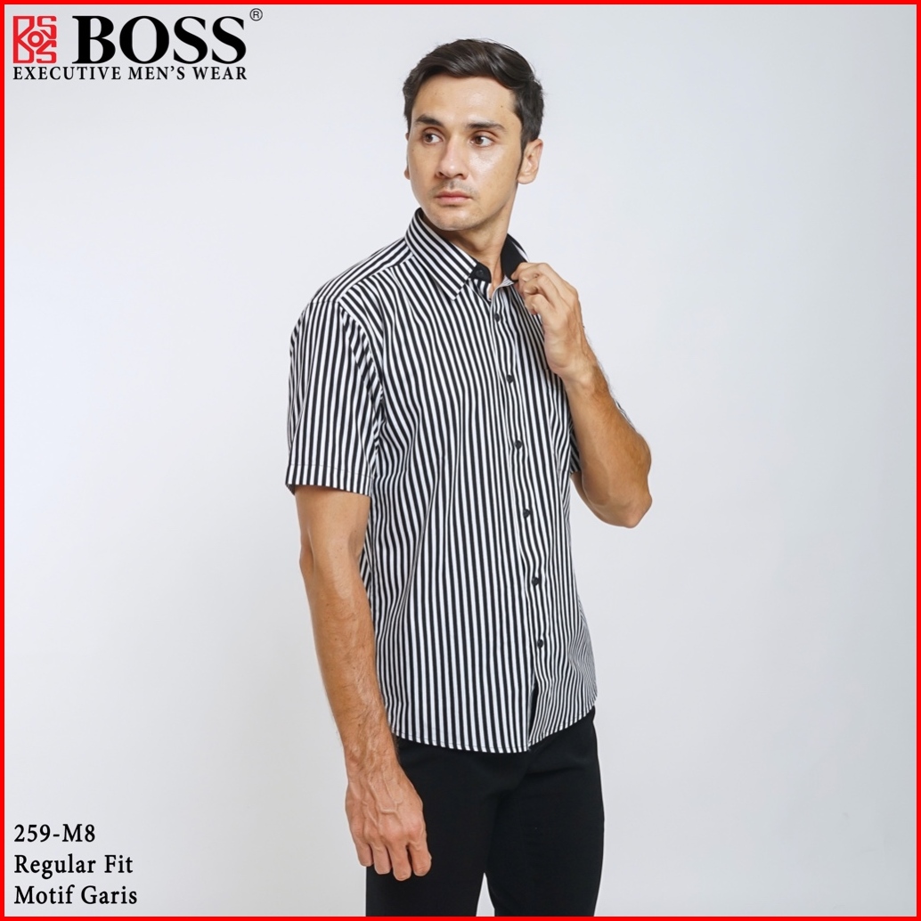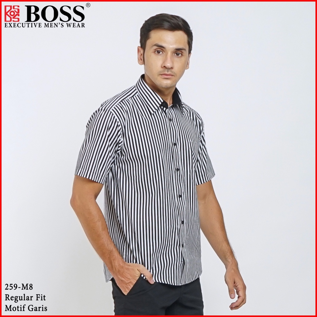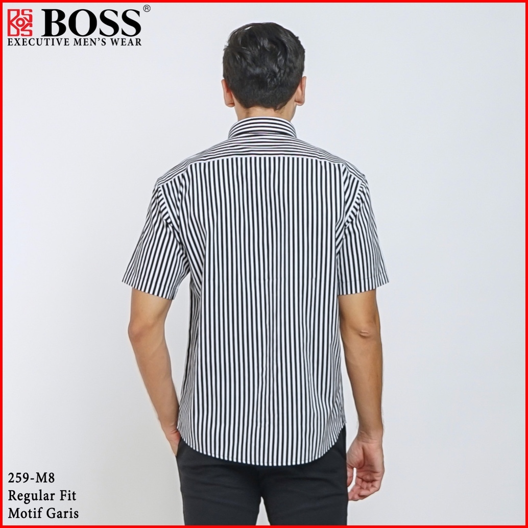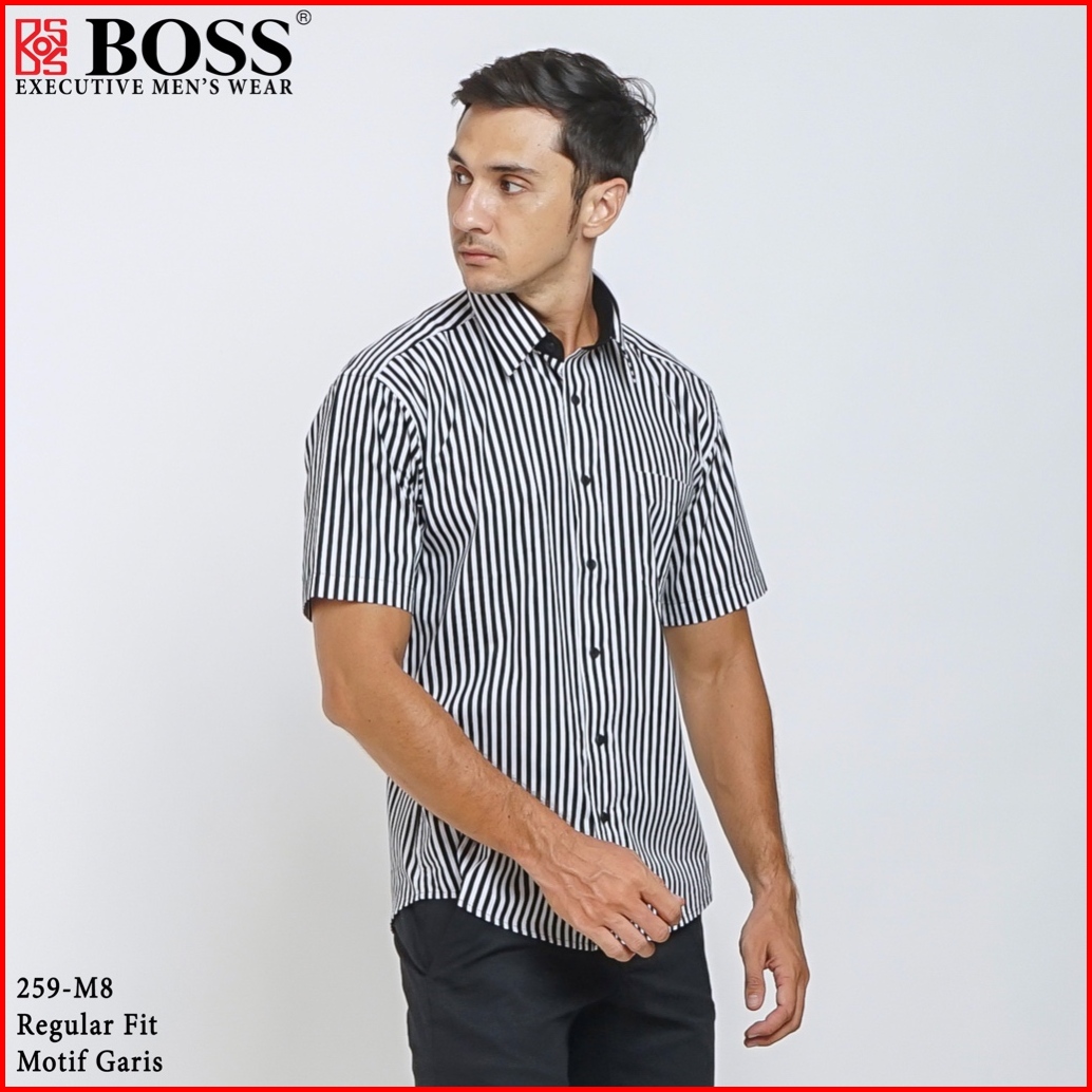 Boss Kemeja Motif Garis Hitam Putih Pria Lengan Pendek Regular Fit 259