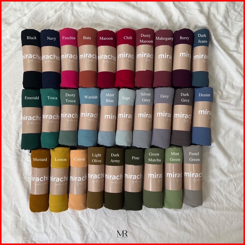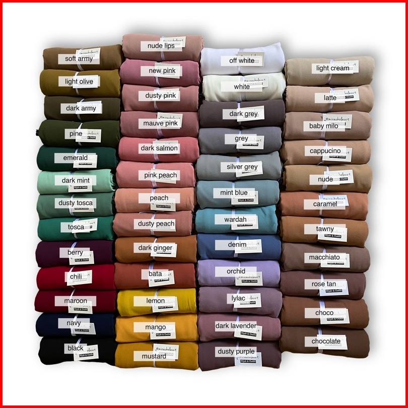 Black, Navy, Maroon, Berry, Emerald, Pine, Dark Army, Light Olive, Mustard, Lemon, Bata, Denim, Dusty Tosca, Wardah, Mint Blue, Dark Cappucino, Lotus, Dusty Green, Mint Green, Dark Gold, Grey, Dark Grey, Dark Maroon, Silver Grey, Light grey, Tumeric, Smoke jeans, Light Jeans, Off White, Broken White, Mauve Purple, Lylac, Dark lavender, Caramel, Coffee Mahogany, Dusty Lylac, New pink, Mauve Pink, Dusty pink, Sand, Dark Choco, Cappucino, Latte, Rose Tan, Tiramisu, Light choco, Griss, Nude Cream, Cream Almond, Light Cream, Taupe, Soft milk, Choco, Baby milo, Pastel Green, Milo, Dove Grey, Nude Pink, Cloud Silver, Walnut, Cookies, Dark Berry, Lawa Brown