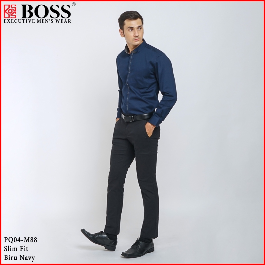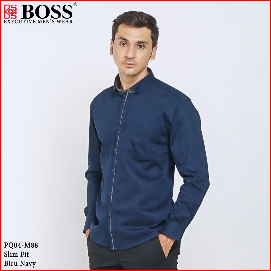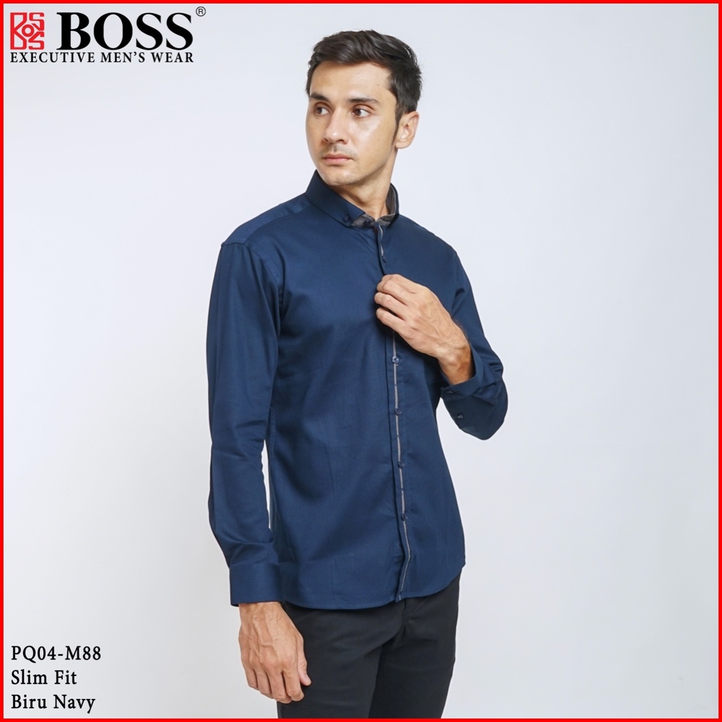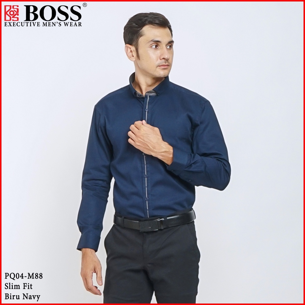 Boss Kemeja Polos Pria Cotton Pique Kombinasi List Tengah Lengan Panjang Slim Fit Pq04 Biru Navy