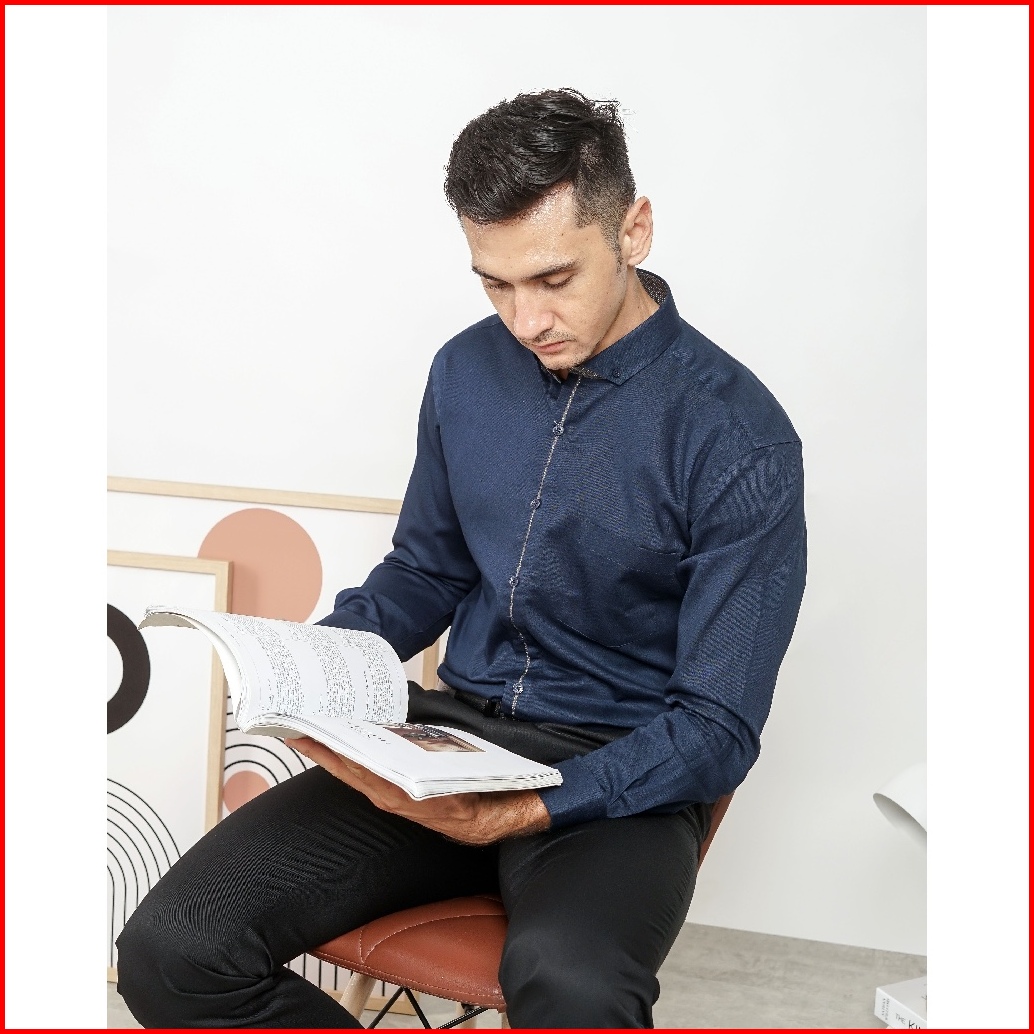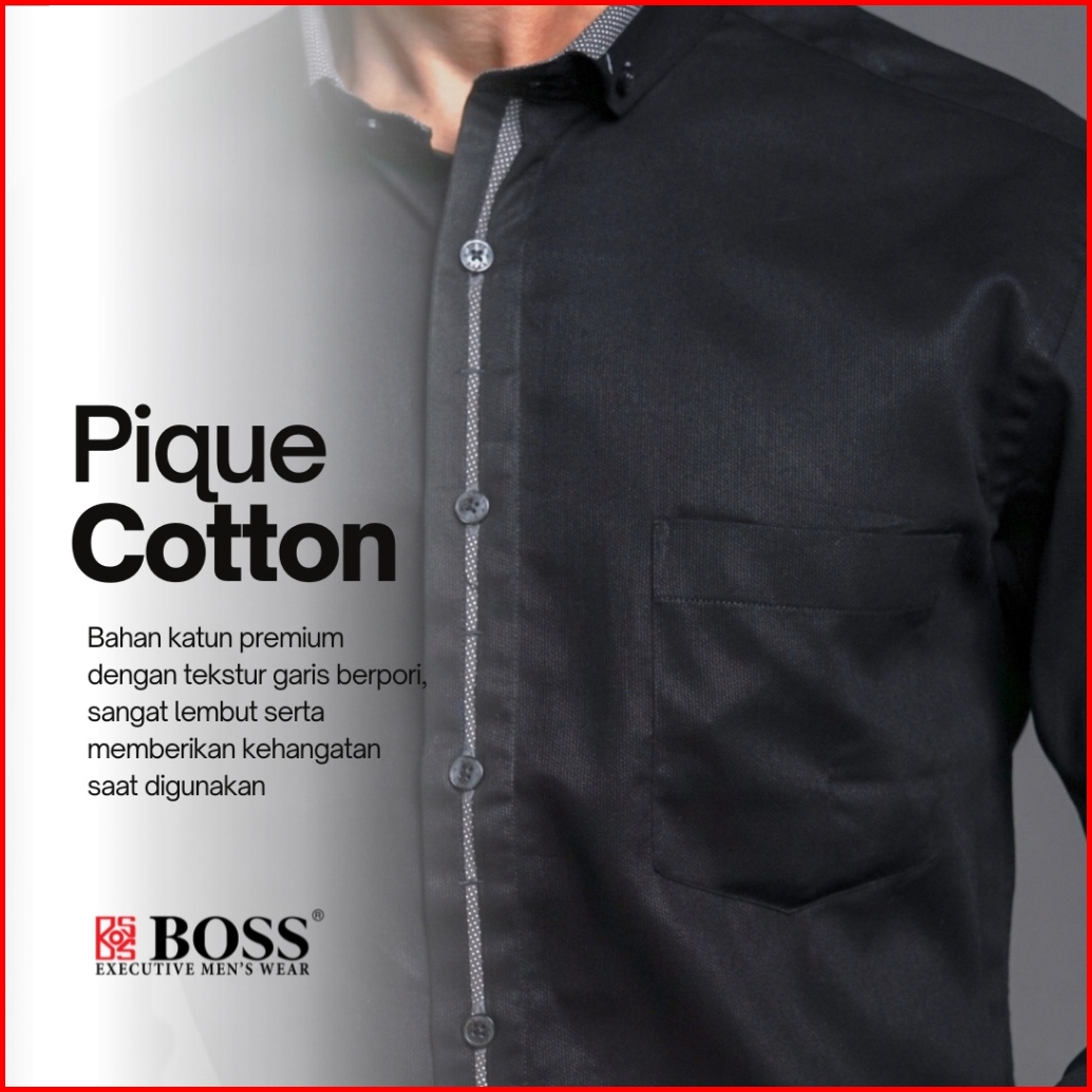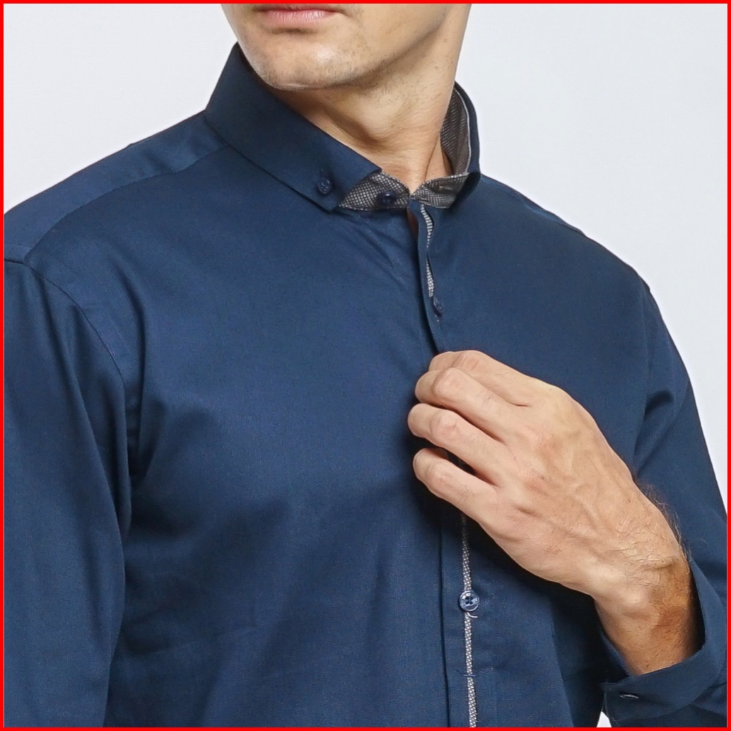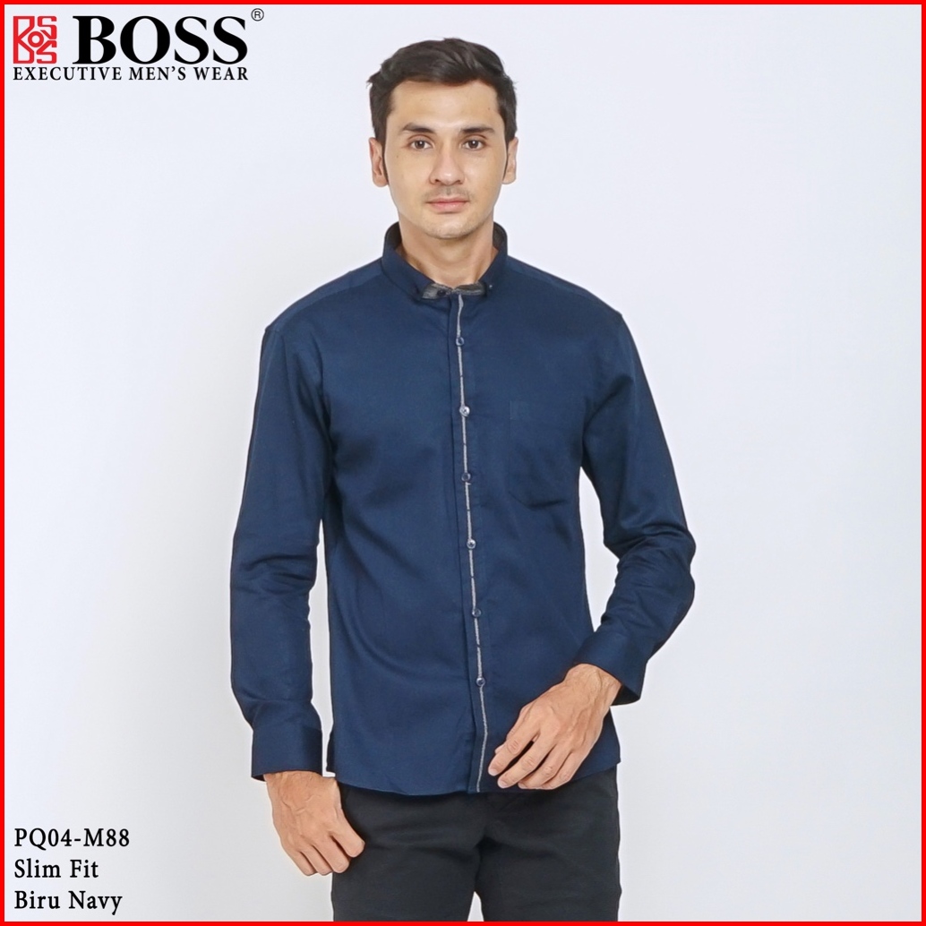 Boss Kemeja Polos Pria Cotton Pique Kombinasi List Tengah Lengan Panjang Slim Fit Pq04 Biru Navy