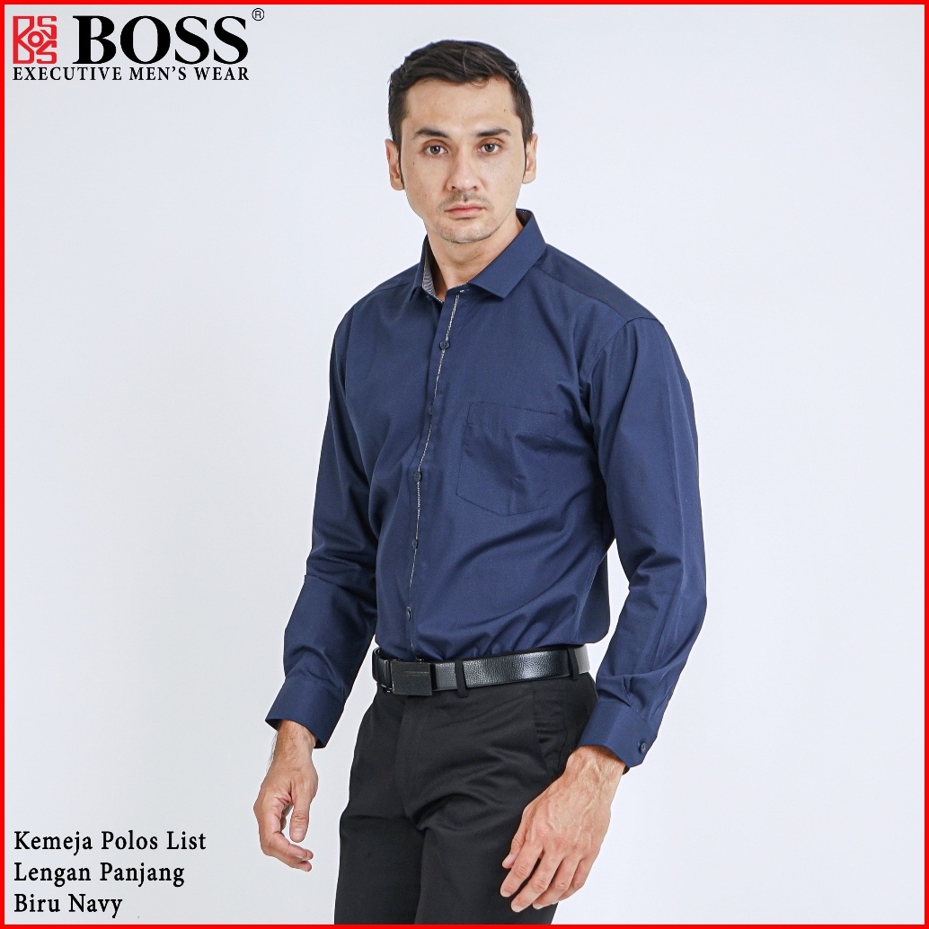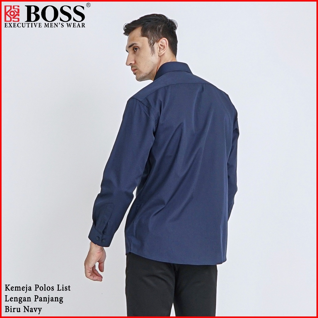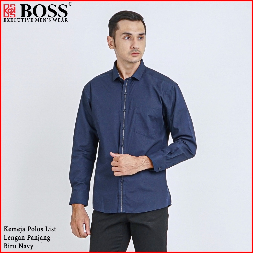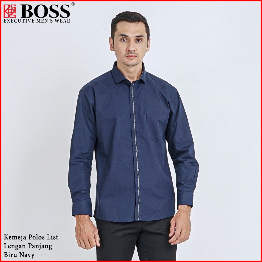 Boss Kemeja Polos Pria Eco Cotton Kombinasi List Tengah Lengan Panjang Slim Fit 1801 Biru Navy