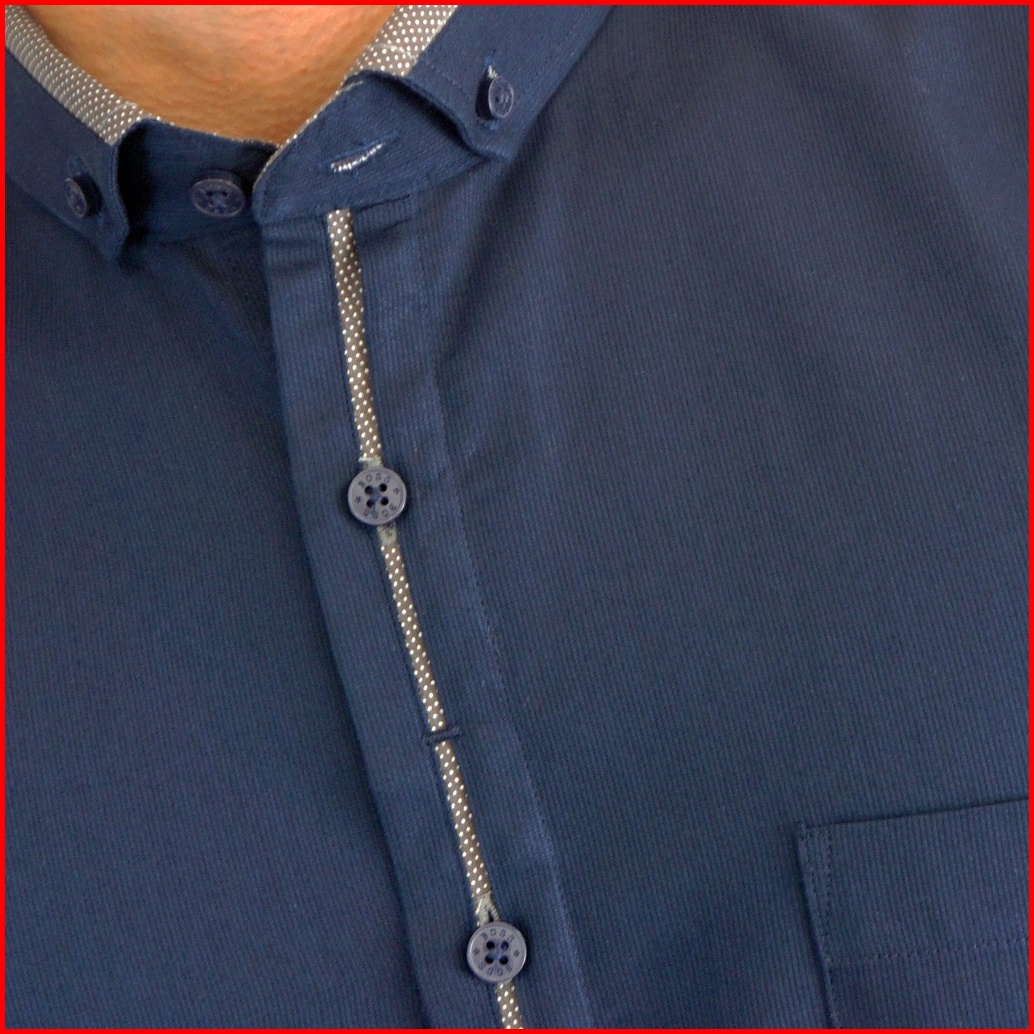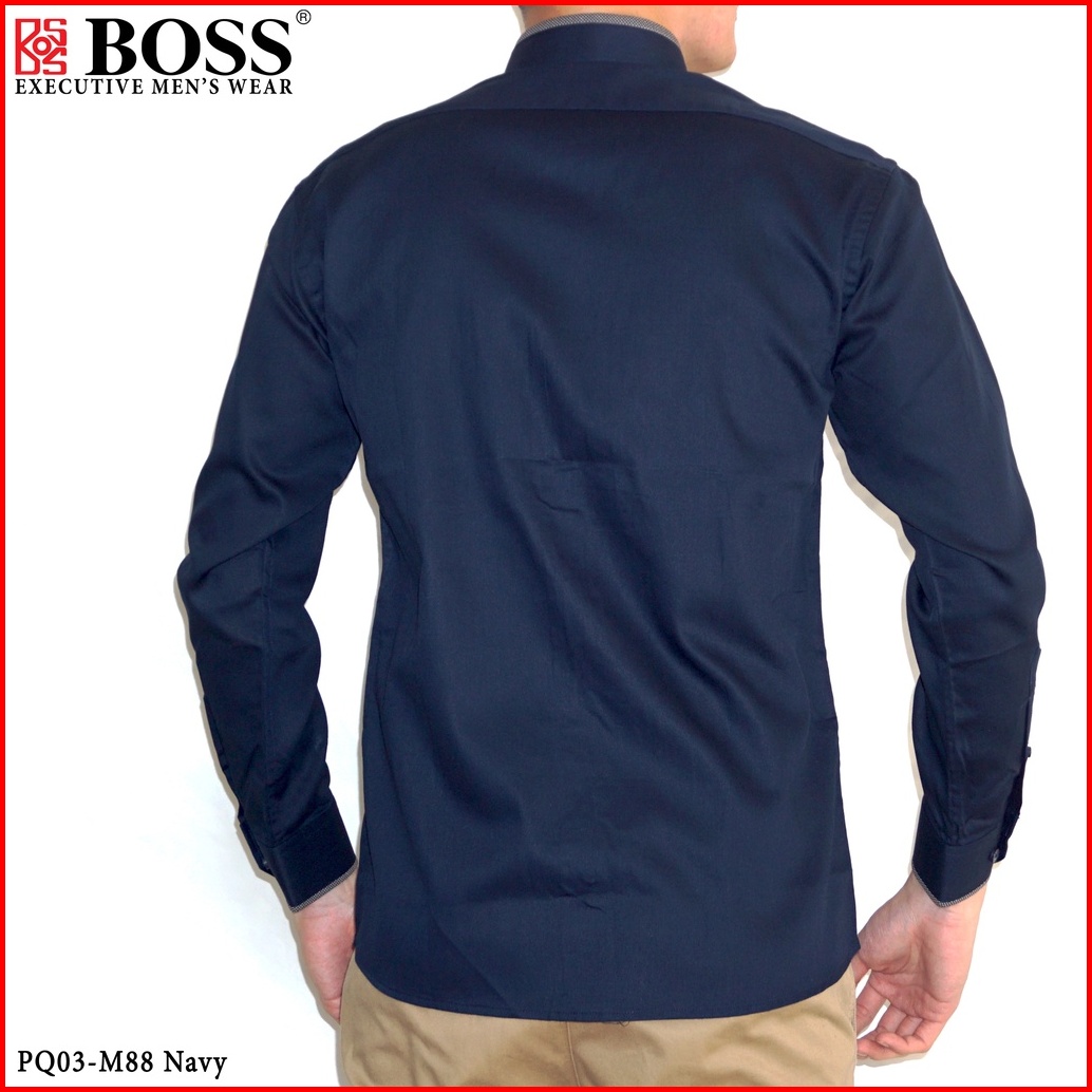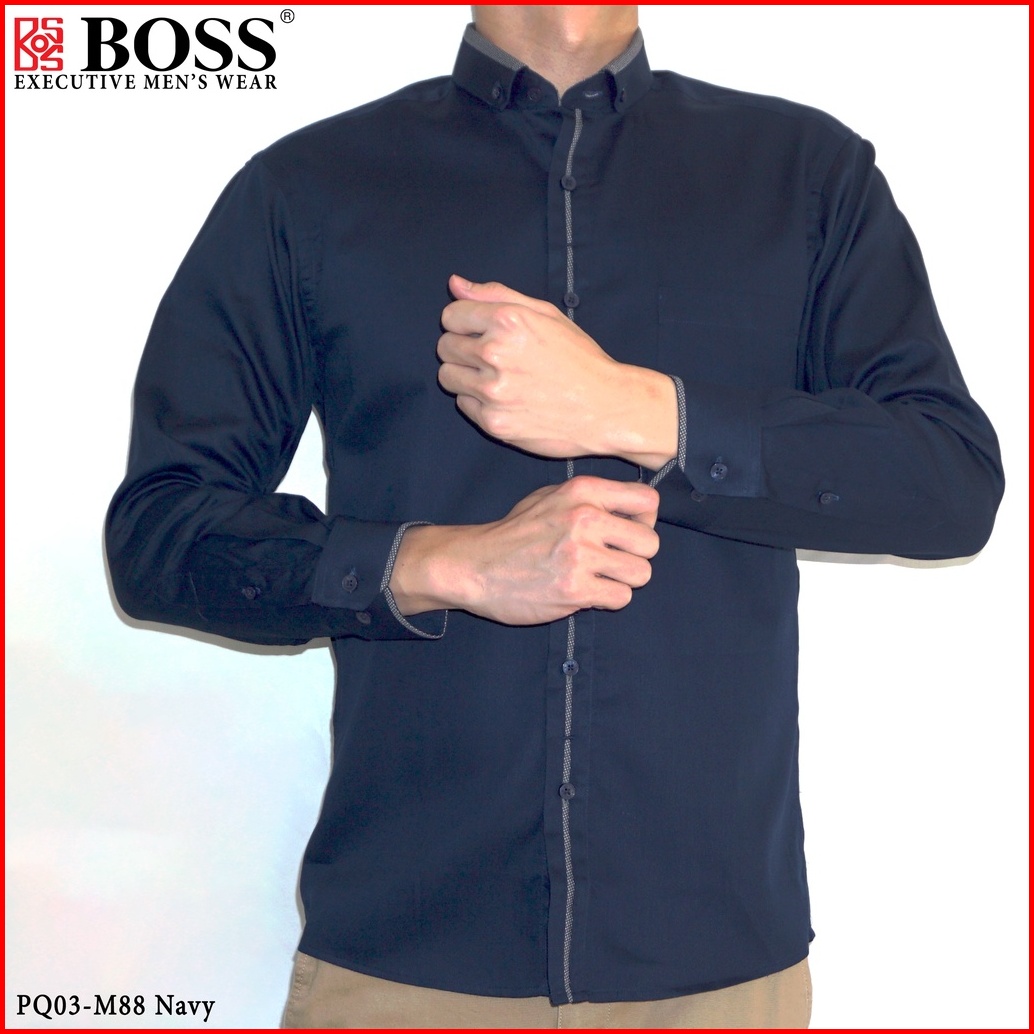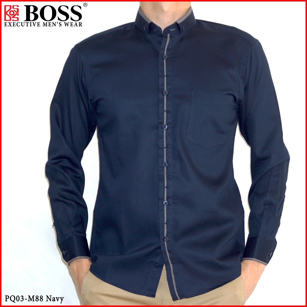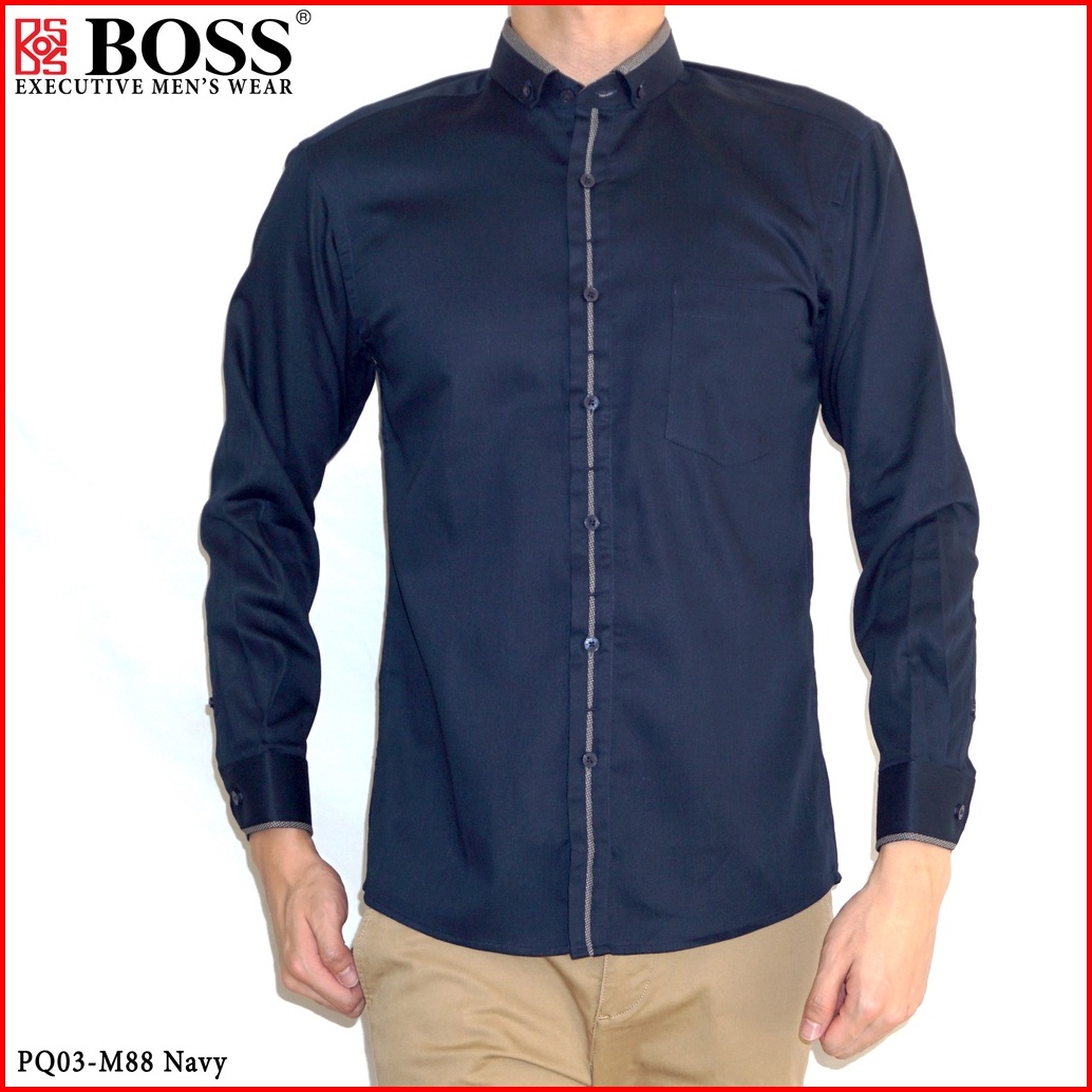 Boss Kemeja Polos Pria Cotton Pique Kombinasi List Tengah Lengan Panjang Slim Fit Pq03 Biru Navy