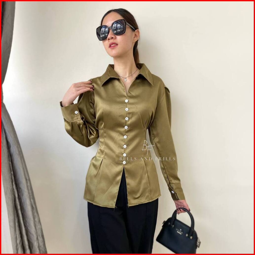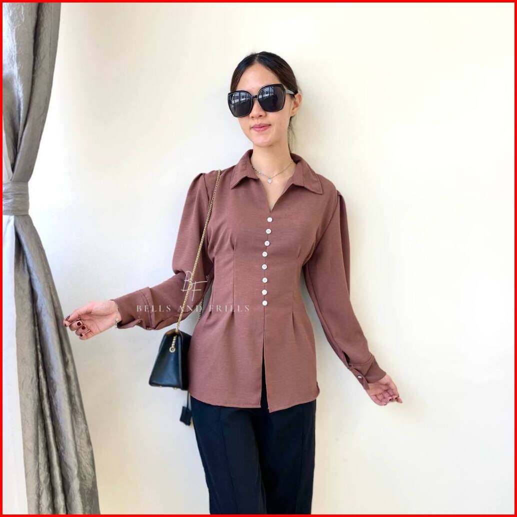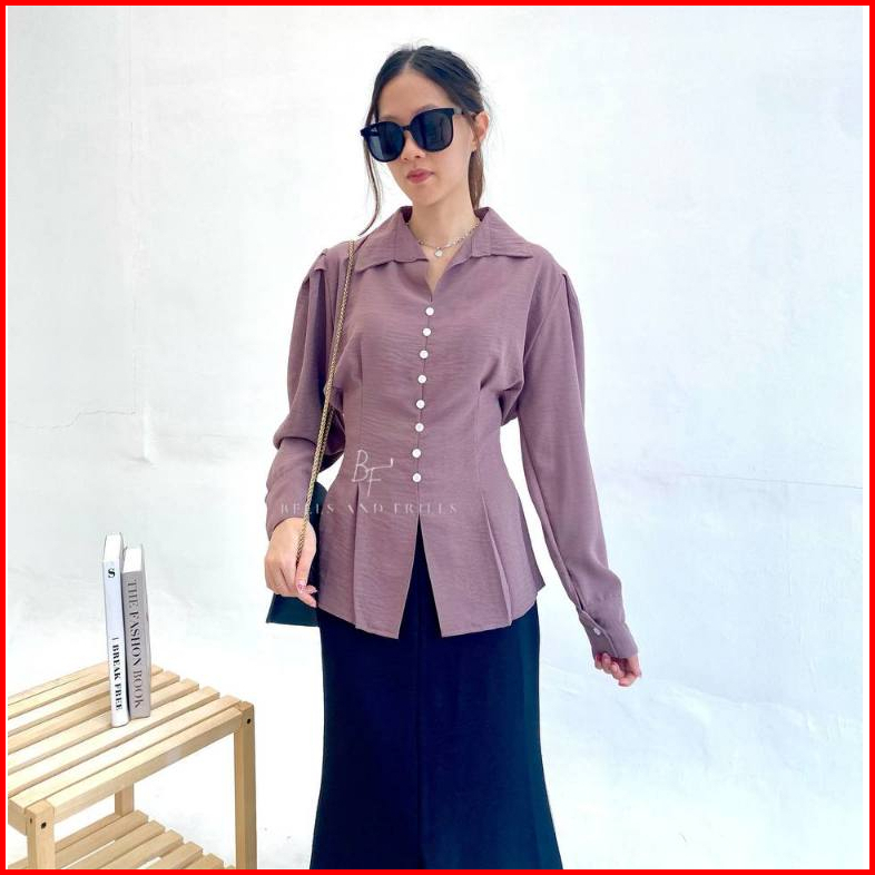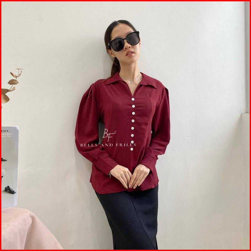 Zia Blouse Crinkle Atasan Long Sleeve V Neck Crincle Airflow Atasan Wanita Kemeja Korean Lengan Puff Panjang 0464