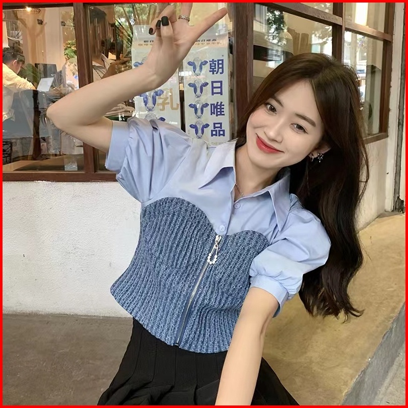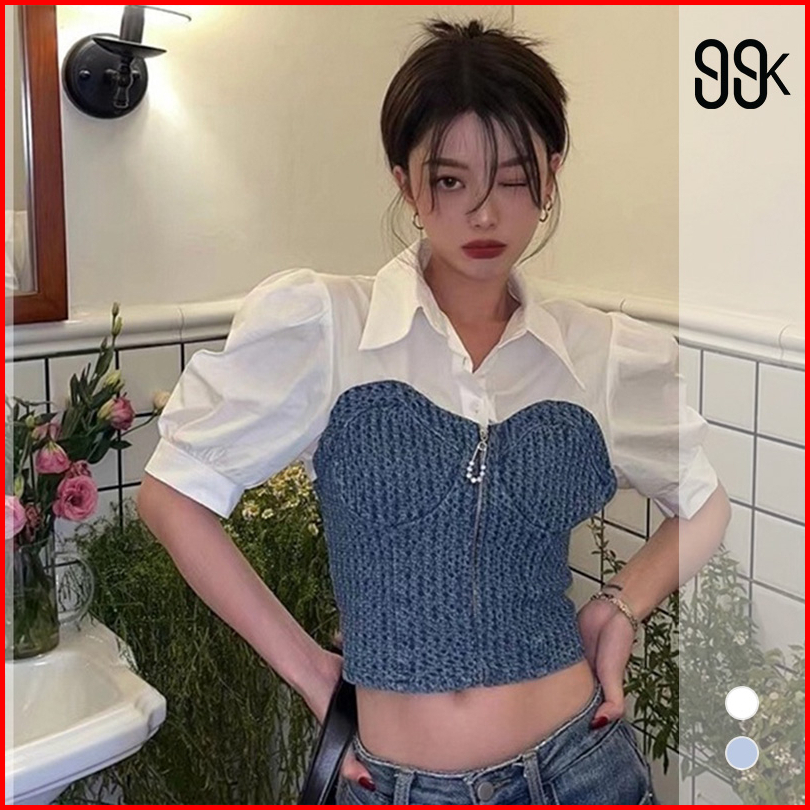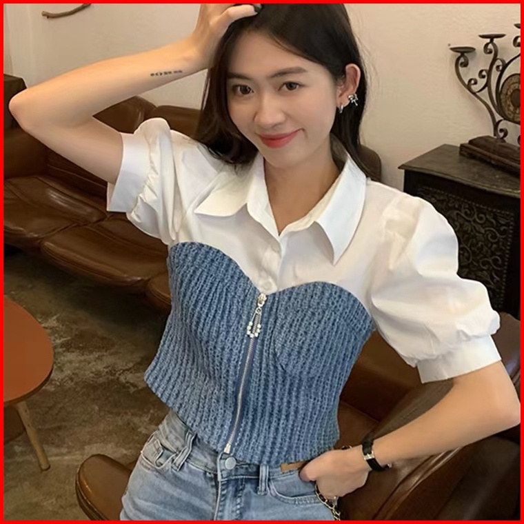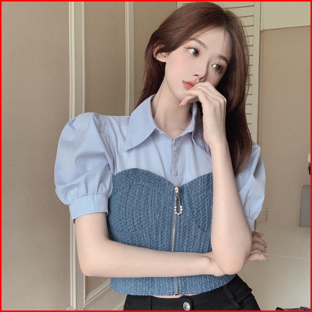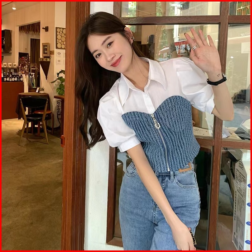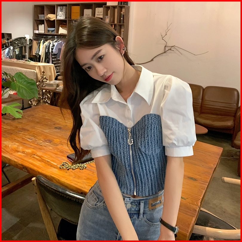 Short Puff Sleeve Collar Denim Tube Patchwork Button Up Shirt 2219 S M L