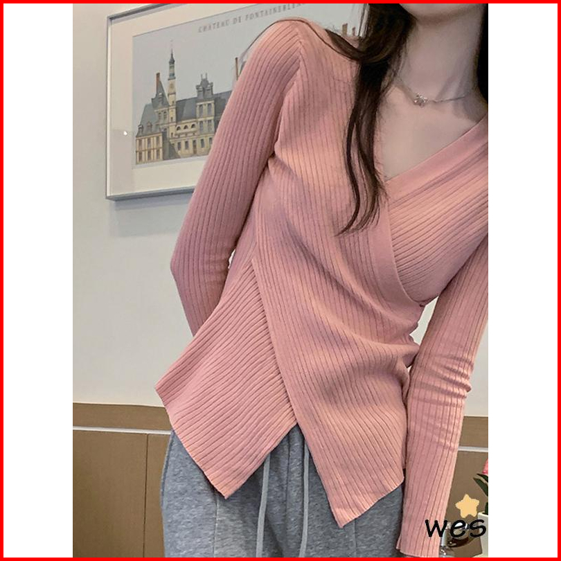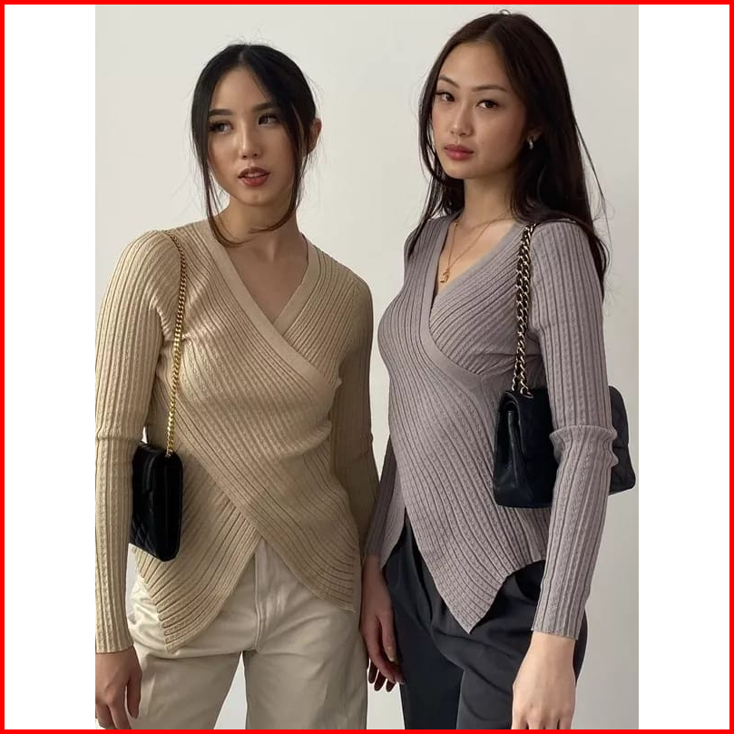 Top Knit V-neck Korean Style Wrap Top - Atasan Rajut Wanita Lengan Panjang