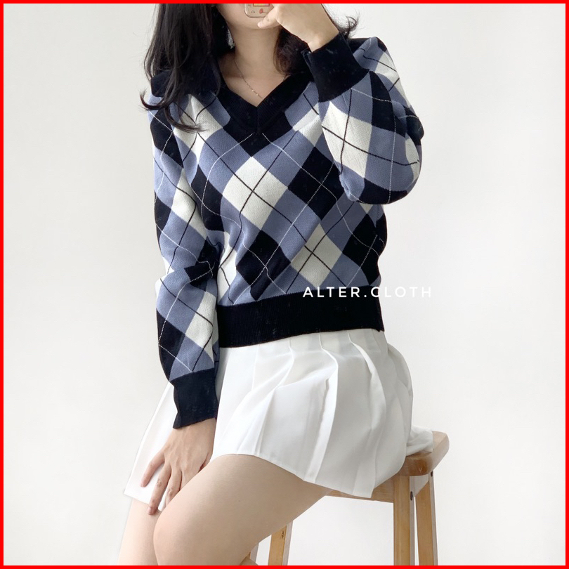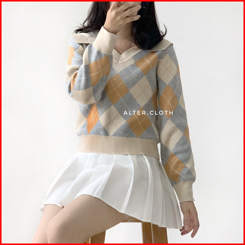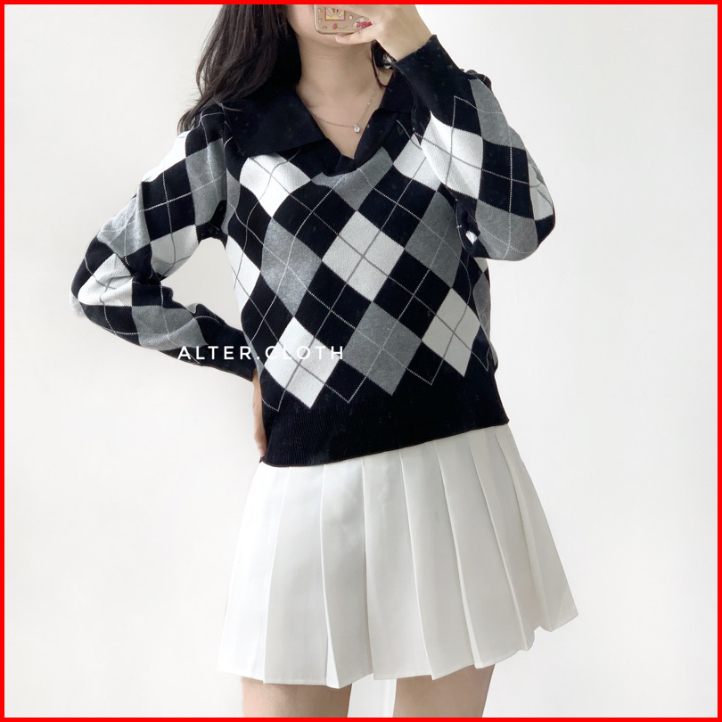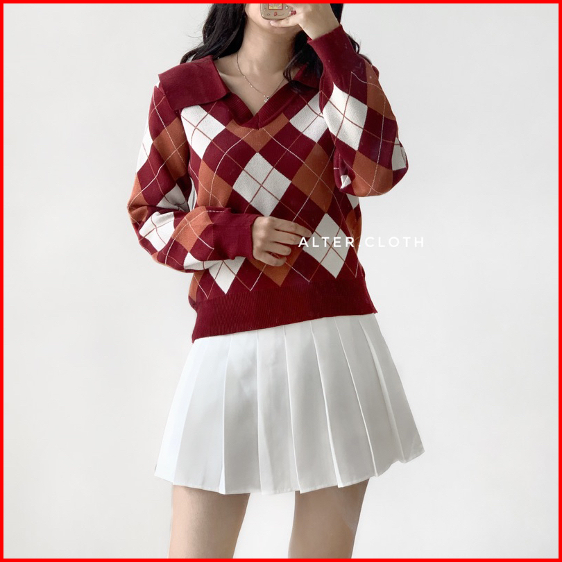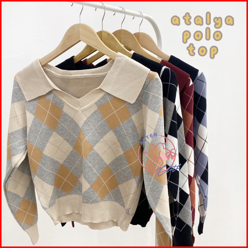 Alter.cloth - Atalya Polo Top Atasan Wanita Lengan Panjang Kerah Argyle Ketupat Premium Knit Rajut Import Halus Fashion