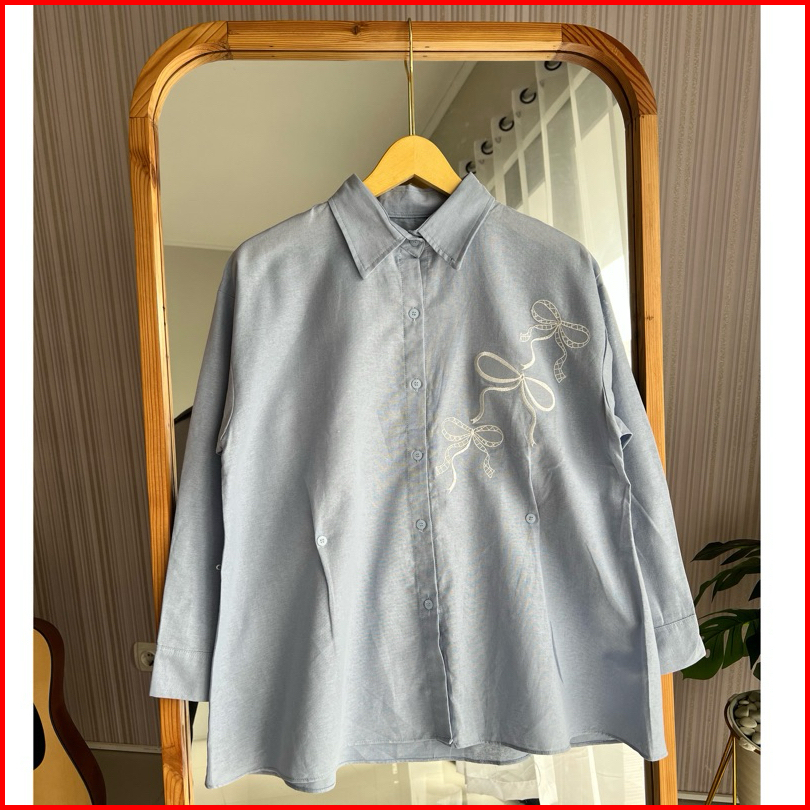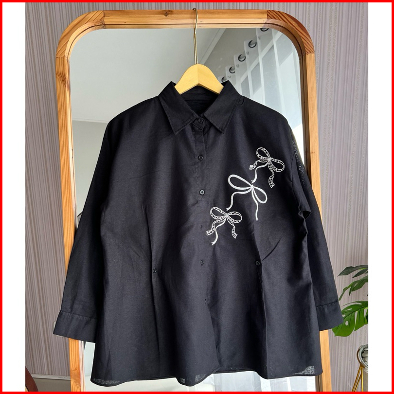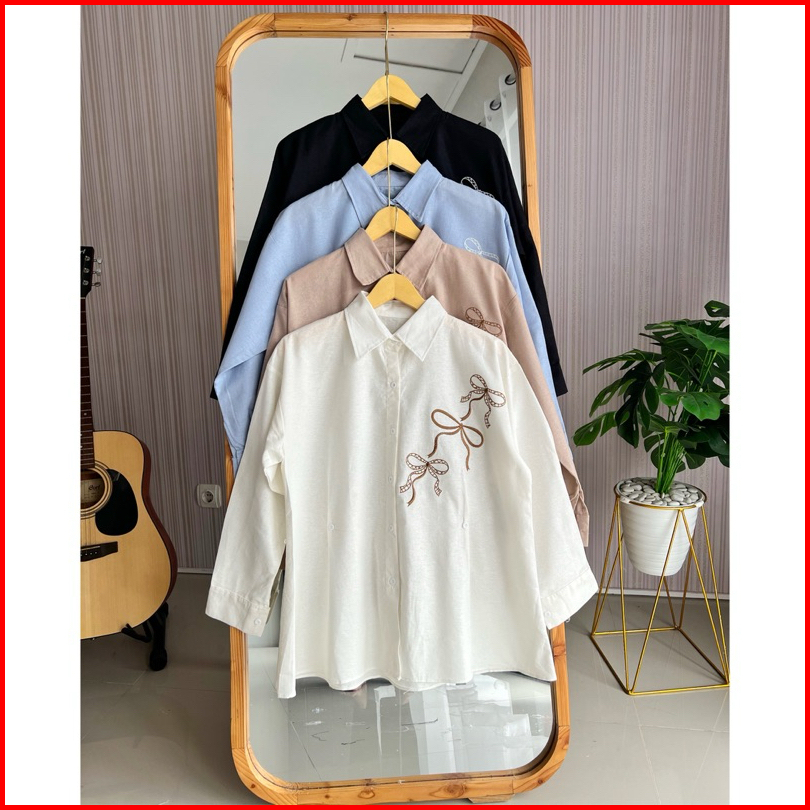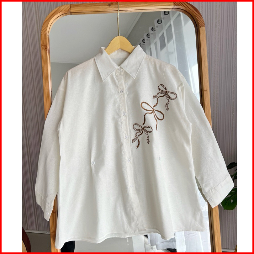 Helena Atasan Wanita Lengan Panjang Bordir Pita Coquette Bahan Katun Linen