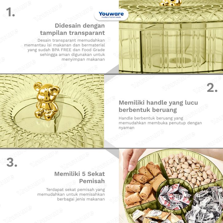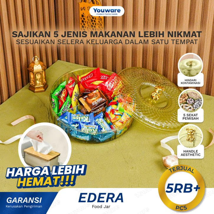 Youware - Edera Toples Makanan Bulat dengan 5 Sekat Besar Penyimpanan Camilan Snack untuk Ruang Tamu dan Keluarga Sajika