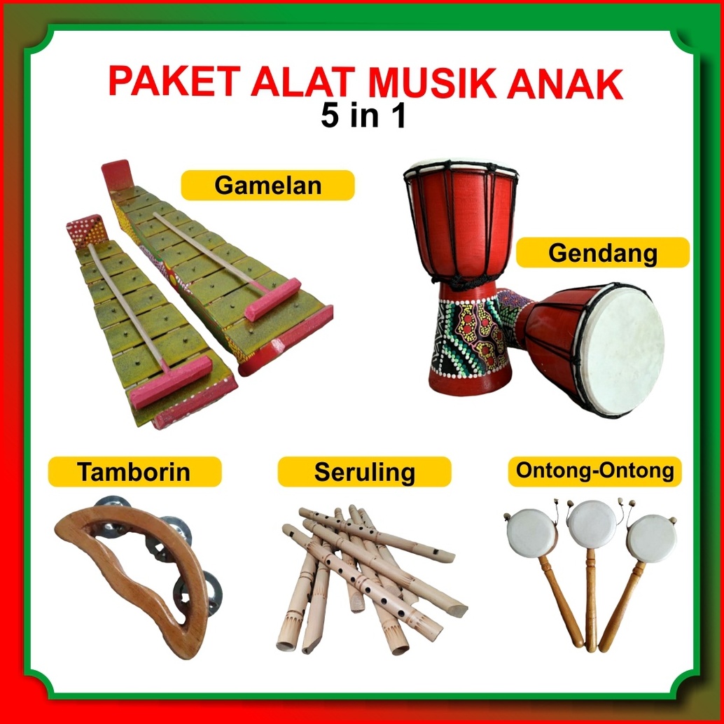 Alat Musik Mainan Edukasi Anak Paket 5 In 1 Gendang Gamelan Mini Seruling Bambu Ontong-ontong Tamborin