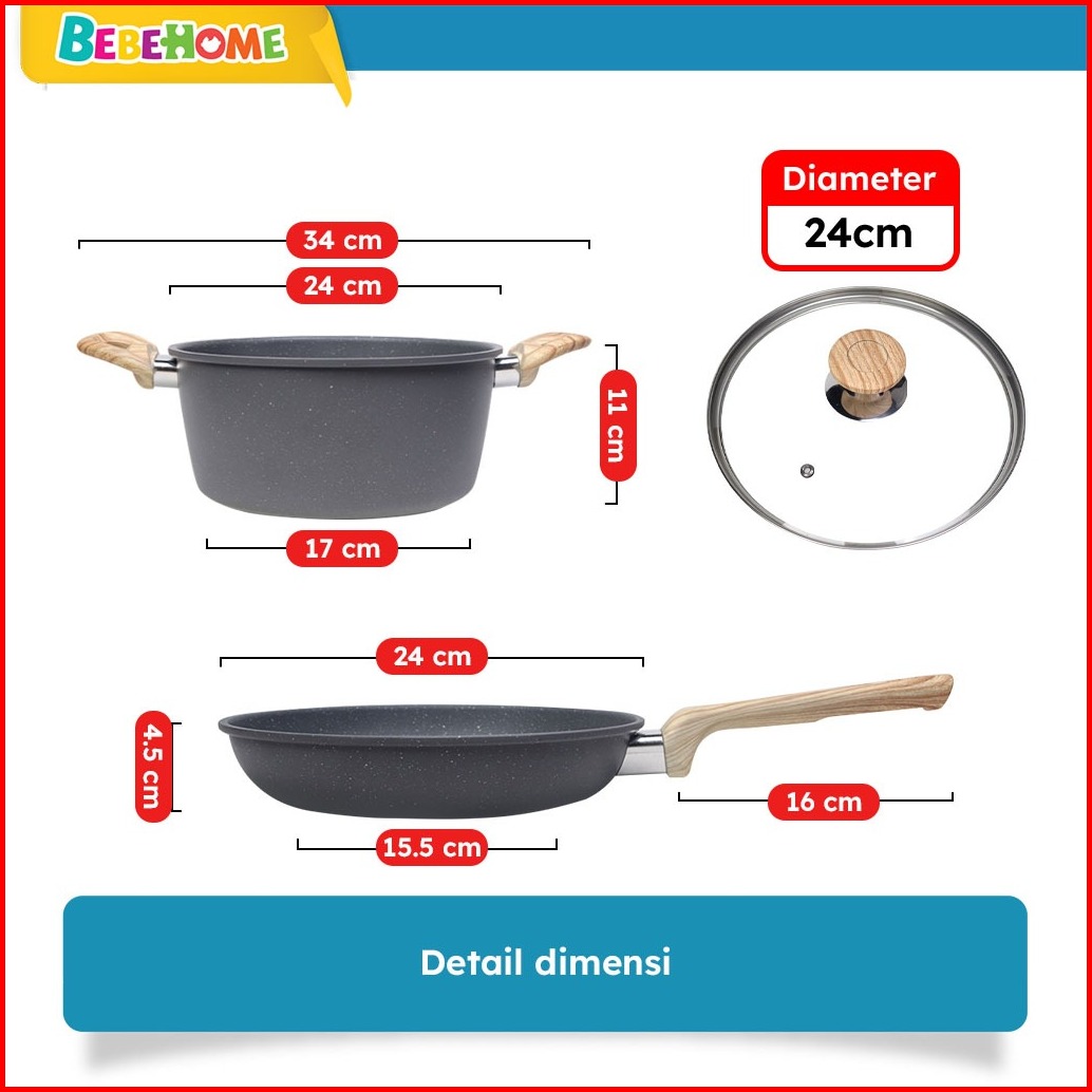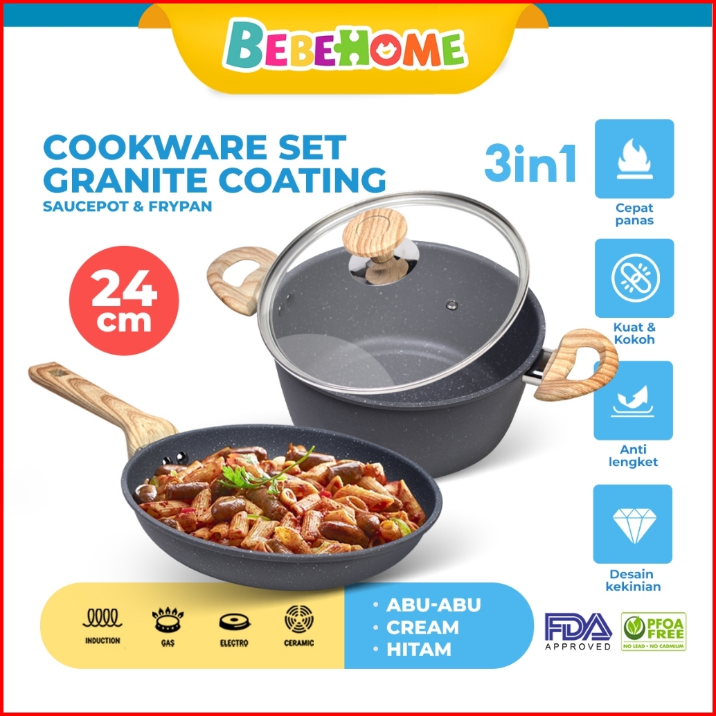 Bebehome X Tifale Celeste 3in1 Set Dark Grey Granite Casserole Frypan Saucepot 24cm Anti Lengket