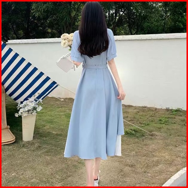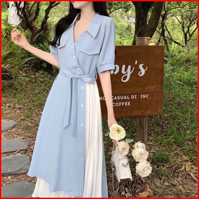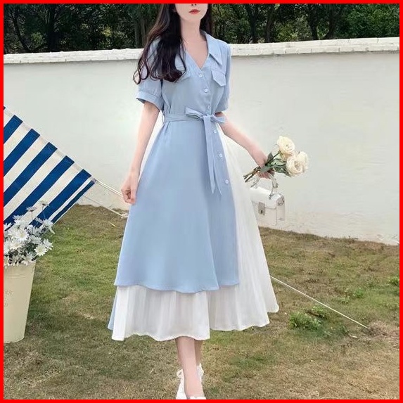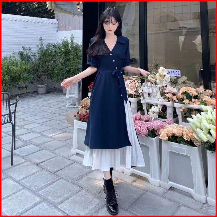 Baru Pinggang Ramping Gaun Ramping Warna Kontras Jahitan Rok Panjang Gaya Korea Dress Korea