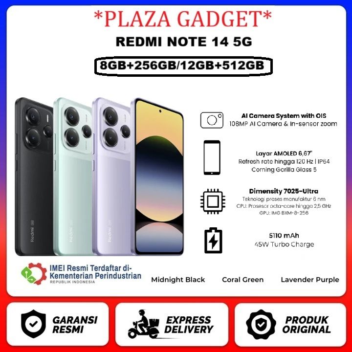 REDMI NOTE 14 5G NFC 8/256GB+12/512GB Prosesor Dimensity 7025-Ultra Baterai 5.110 mAh (standar)Pengisian daya turbo 45
