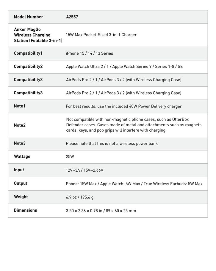 Anker MagGo 3-in-1 Charging Station, MagSafe-Compatible Wireless Charger Stand, Qi2 Certified 15W - A2557