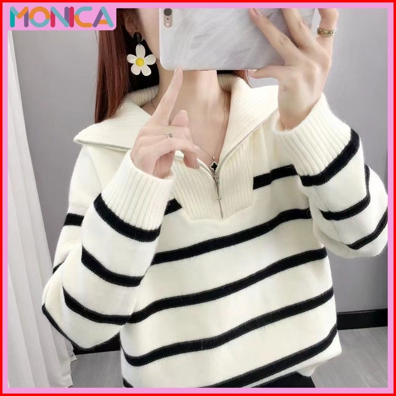 Monica Sweater Stripe Classy Zipper Rajut Wol Santai V-neck Polos Bunga Setrip Hitam Putih