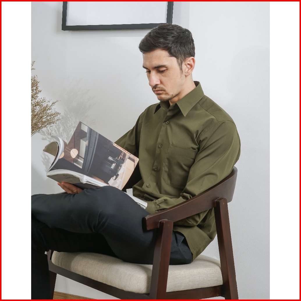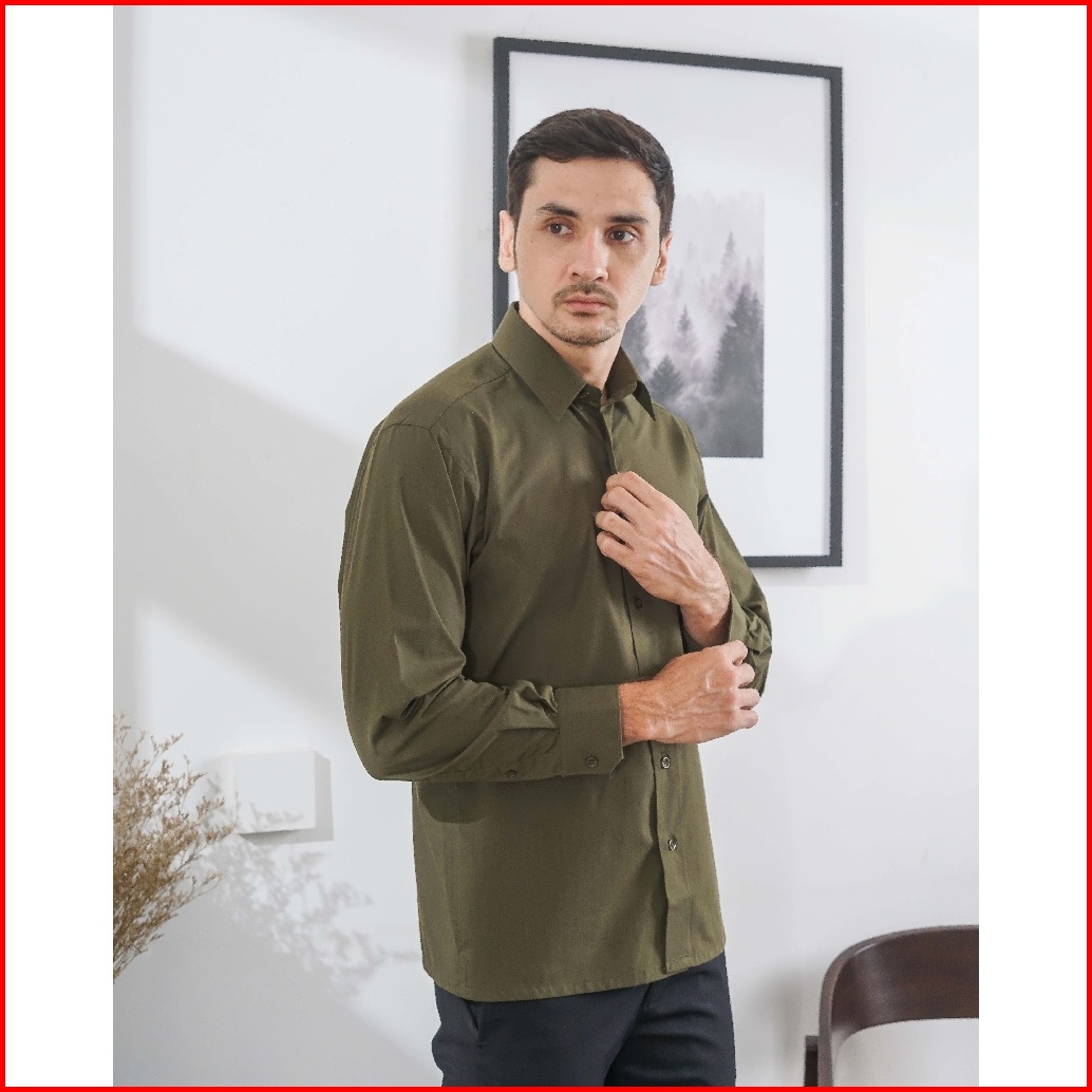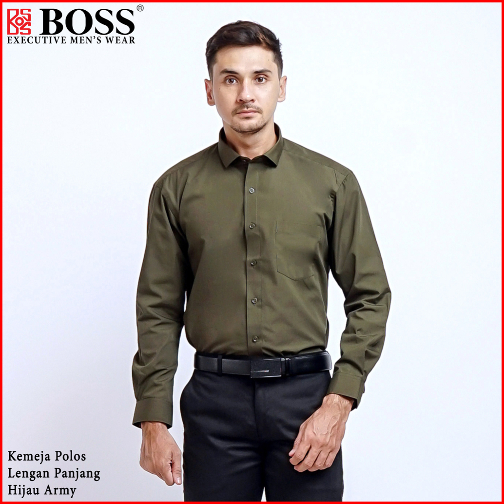 Boss Kemeja Polos Pria Lengan Panjang Hijau Army