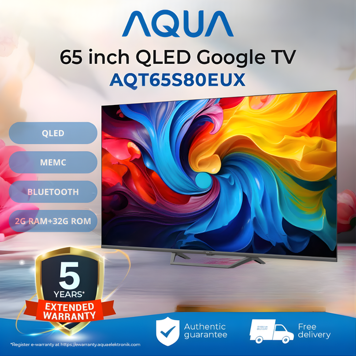 AQUA GOOGLE TV 65 INCH QLED 4K HDR TELEVISI SMART DIGITAL ANDROID RAM 2GB ROM 32GB MURAH 55 50 IN BEZEL LESS