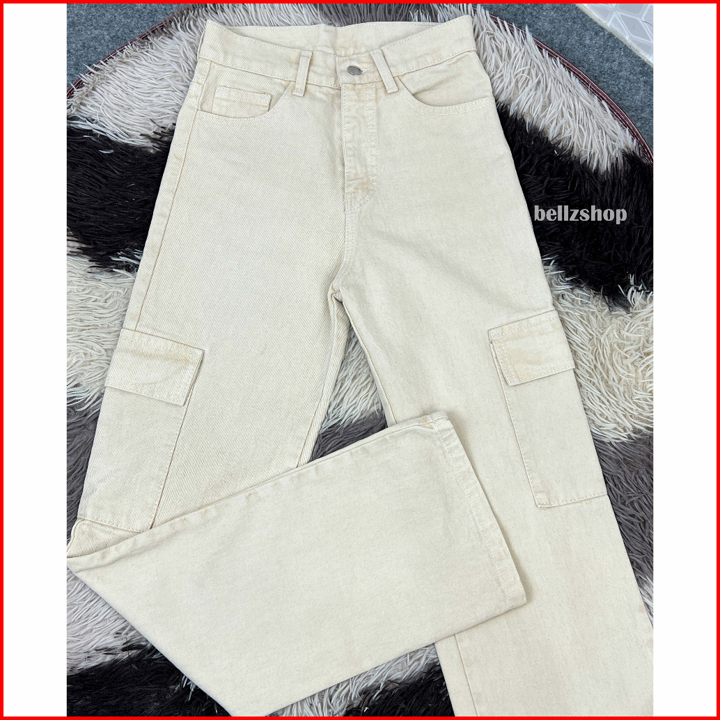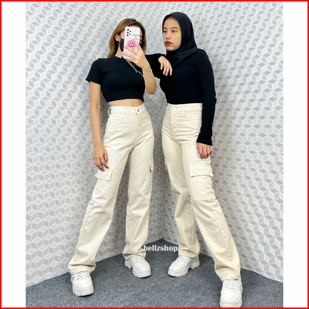 Keira Celana Kulot Jeans Cargo Highwaist Panjang Cream Unisex Kekinian Premium