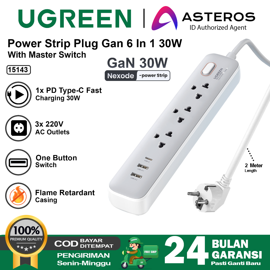 UGREEN Power Strip 6 IN 1 Stop Kontak + Adapter 30W USB A USB C 15143
