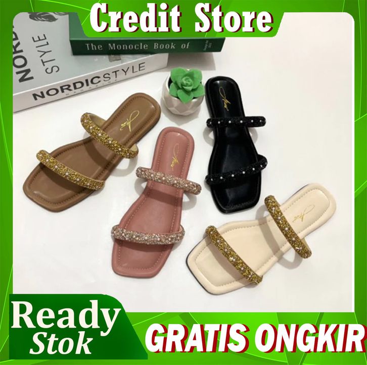 CREDIT STORE SANDAL SLOP WANITA SANDAL SEPATU WANITA Xyla Sandal Flat Wanita Busa Empuk Tali Selah 2 Mutiara Besar