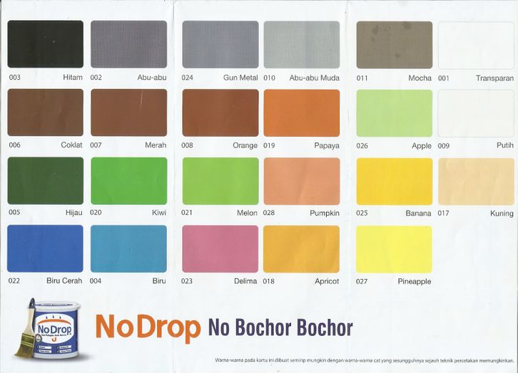 APPLE 026 , MELON 021 , KIWI 020, BIRU 004 , BIRU CERAH 022 , PUTIH 009, KUNING 017 , BANANA 025, PAPAYA 019, STRAWBERRY 029 , LAKESTONE 032, SANDSTONE 031 , MOCHA 011 , MERAH 007, COKLAT 006 , ABU ABU MUDA 010, HITAM 003, ABU ABU 024, TRANSPARAN , ABU VULKANIK 033 , GUAFA 034, CHAMPAGNE 035, BIRU LAUT 036, AQUAMARINE B24-001 , GRAPE 030, Violet Distraction , Plum Dressing , Pistachio Cake, Quiet Village , Sky Garden, Stone Wall, Ambient Music