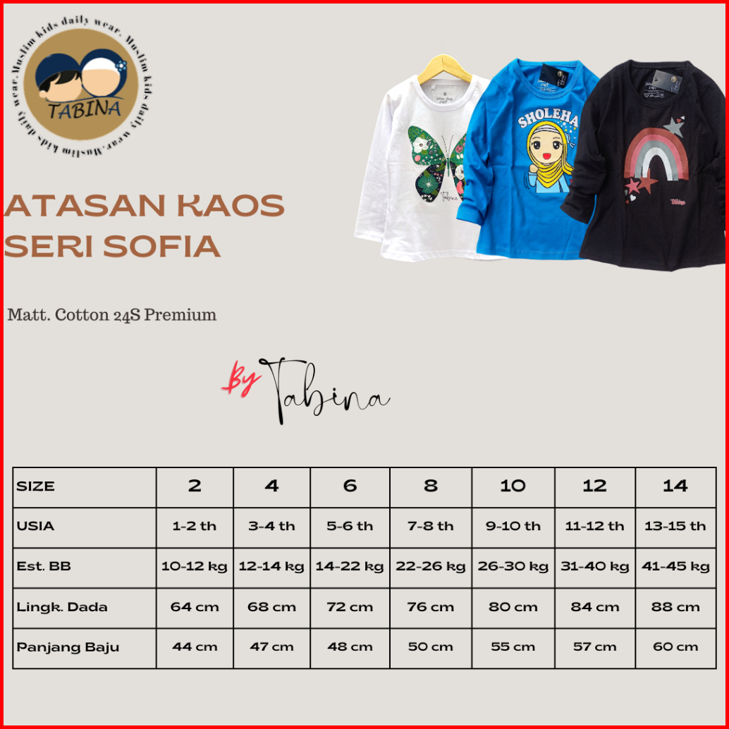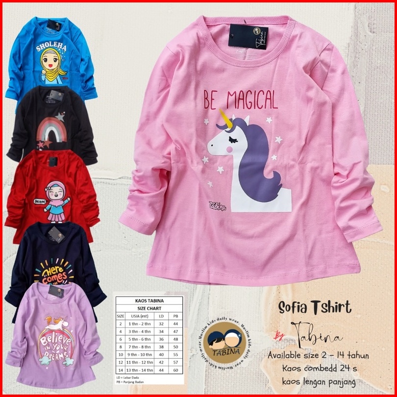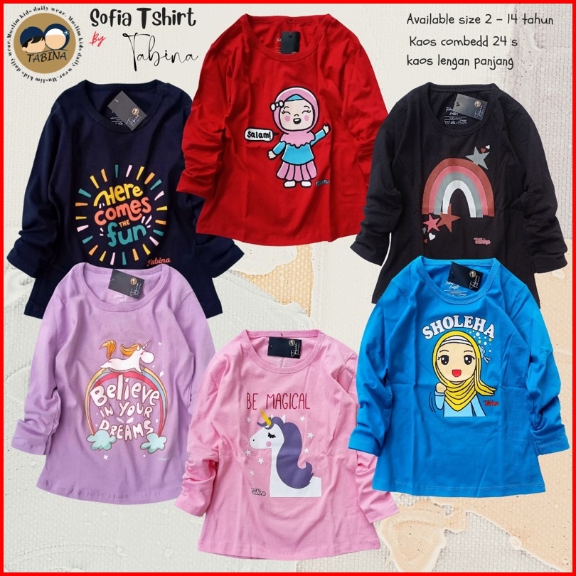 Tabina Kaos Anak Perempuan Lengan Panjang Seri Sofia Usia 2 Tahun Hingga 14 Tahun Max Bb 45 Kg