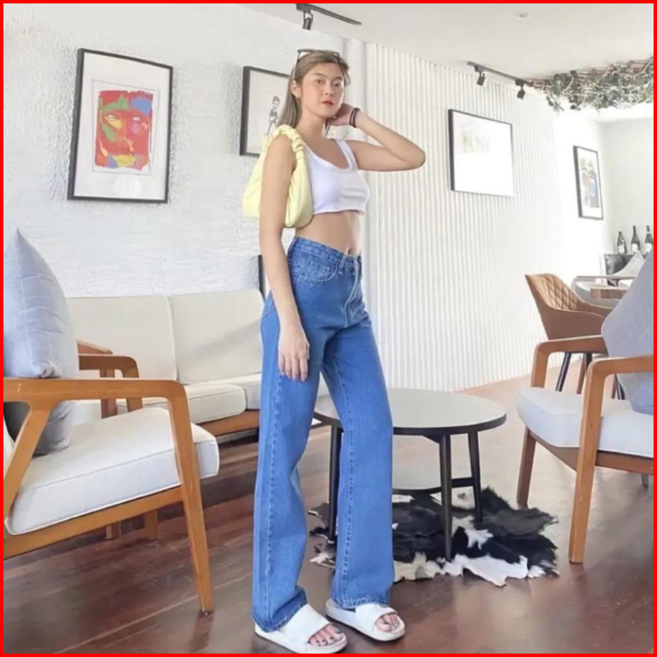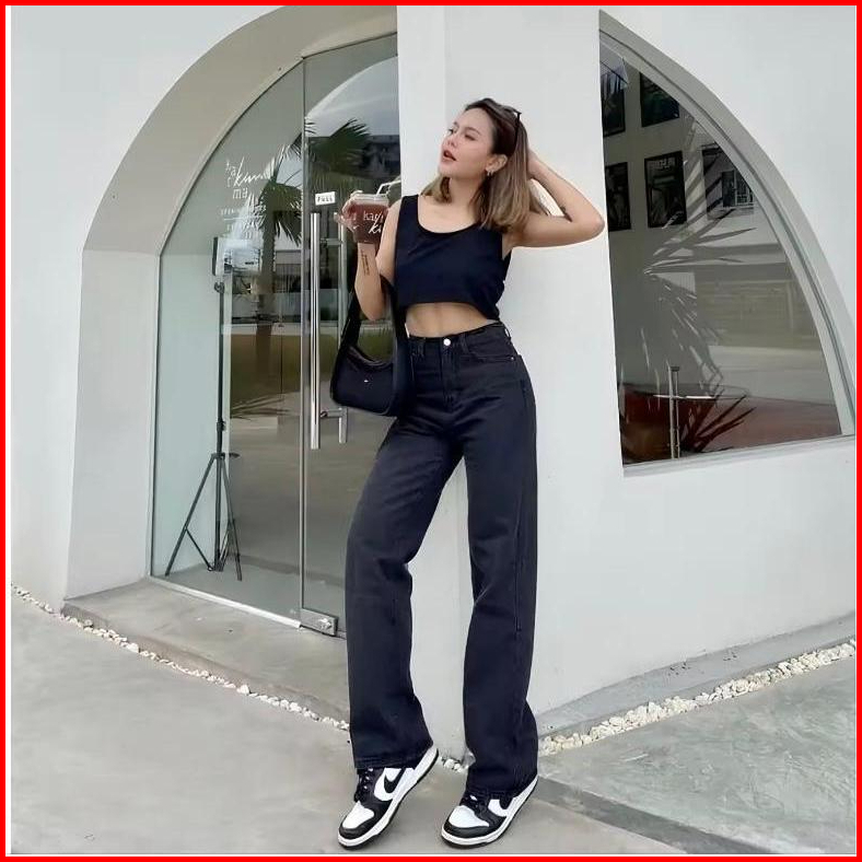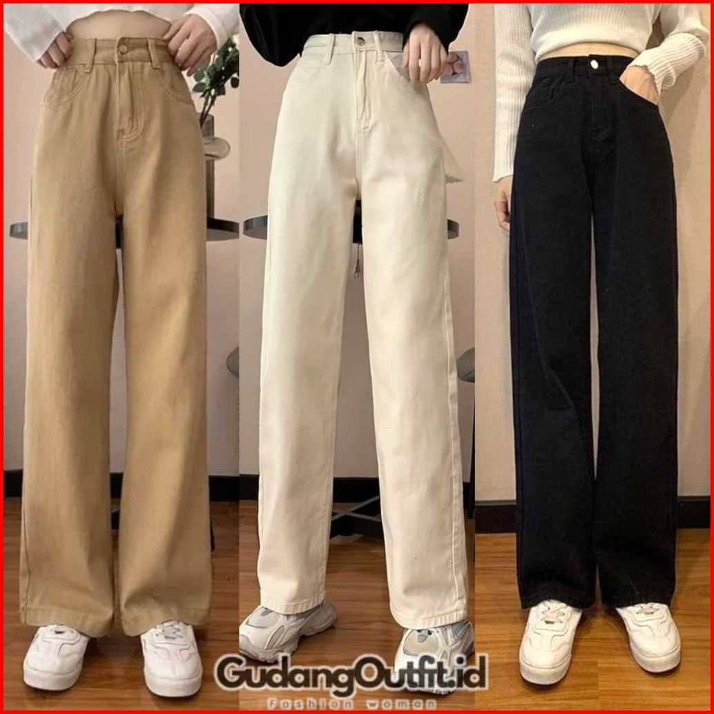 Celana Jeans Wanita Highwaist Kulot Loose Panjang Polos
