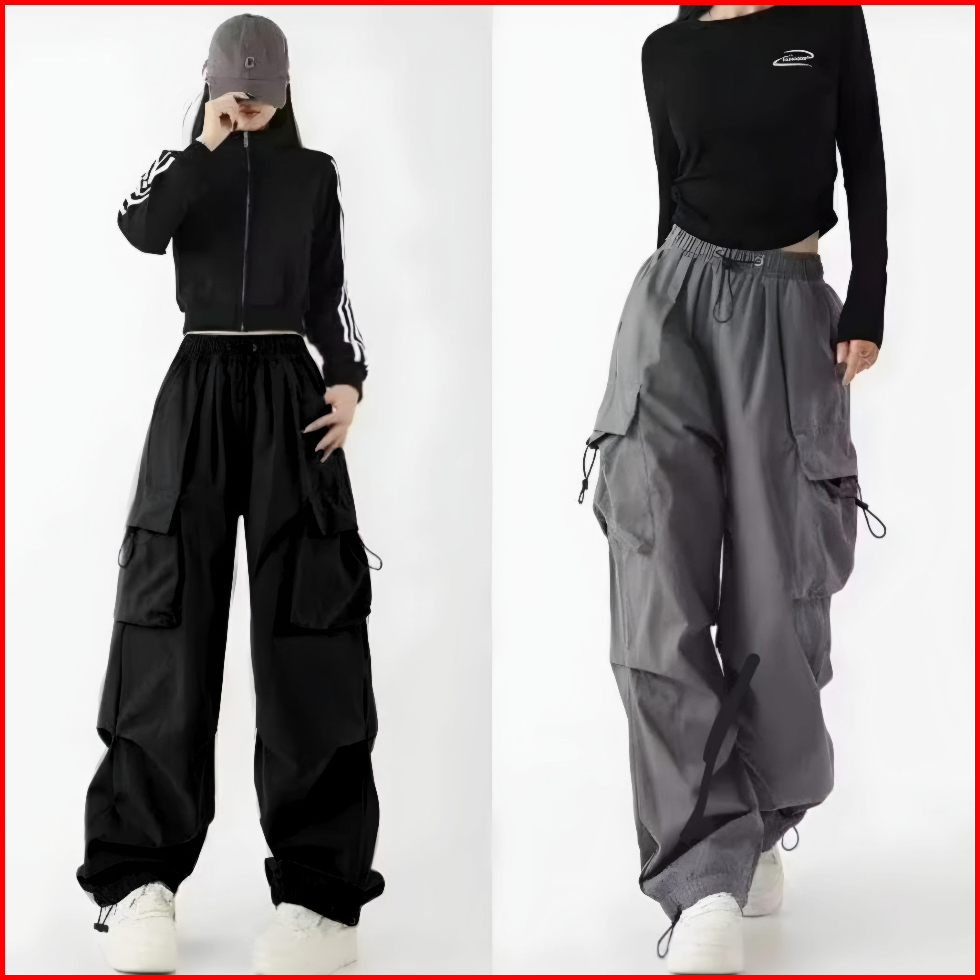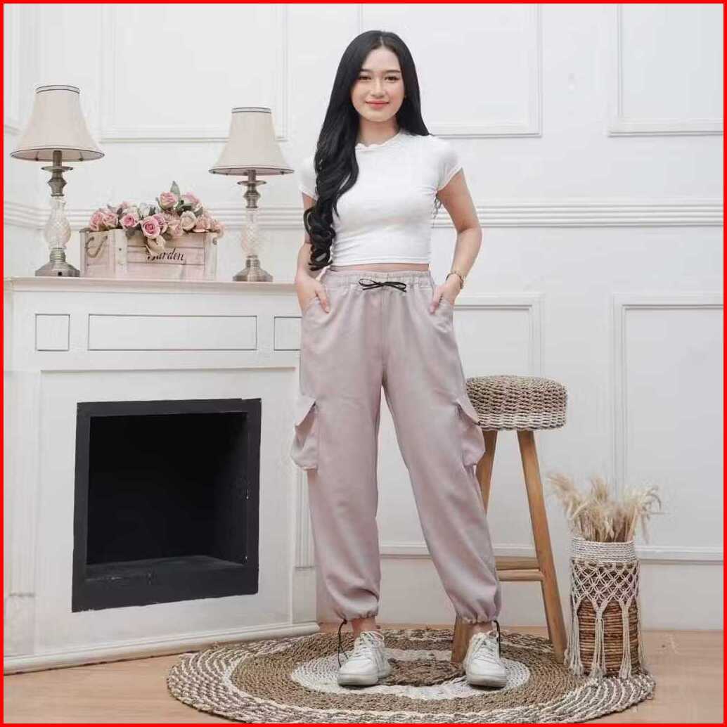 Celana Cargo Wanita Panjang High Waist Loose Pants Korean Stail Tali Serut Standart Jumbo Cargo Pants Wanita