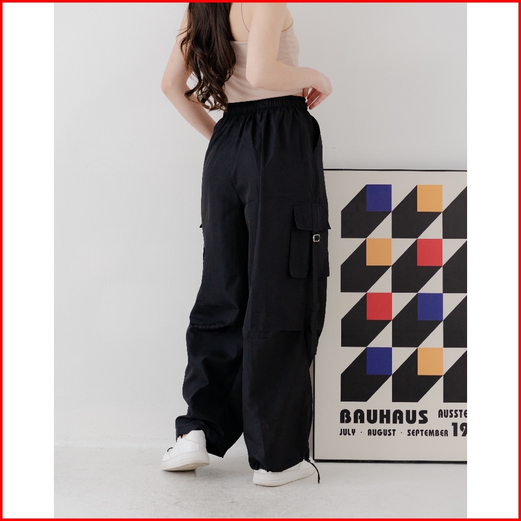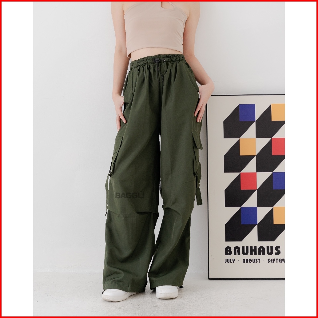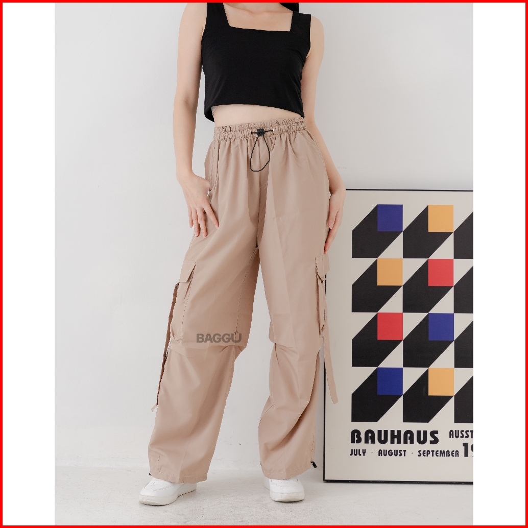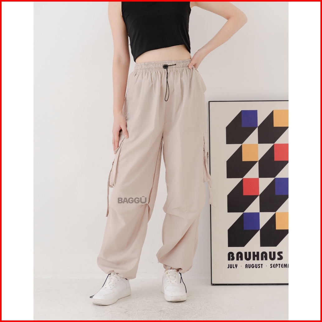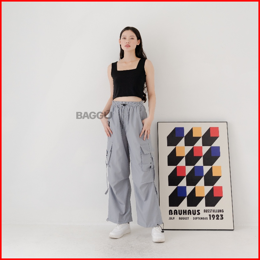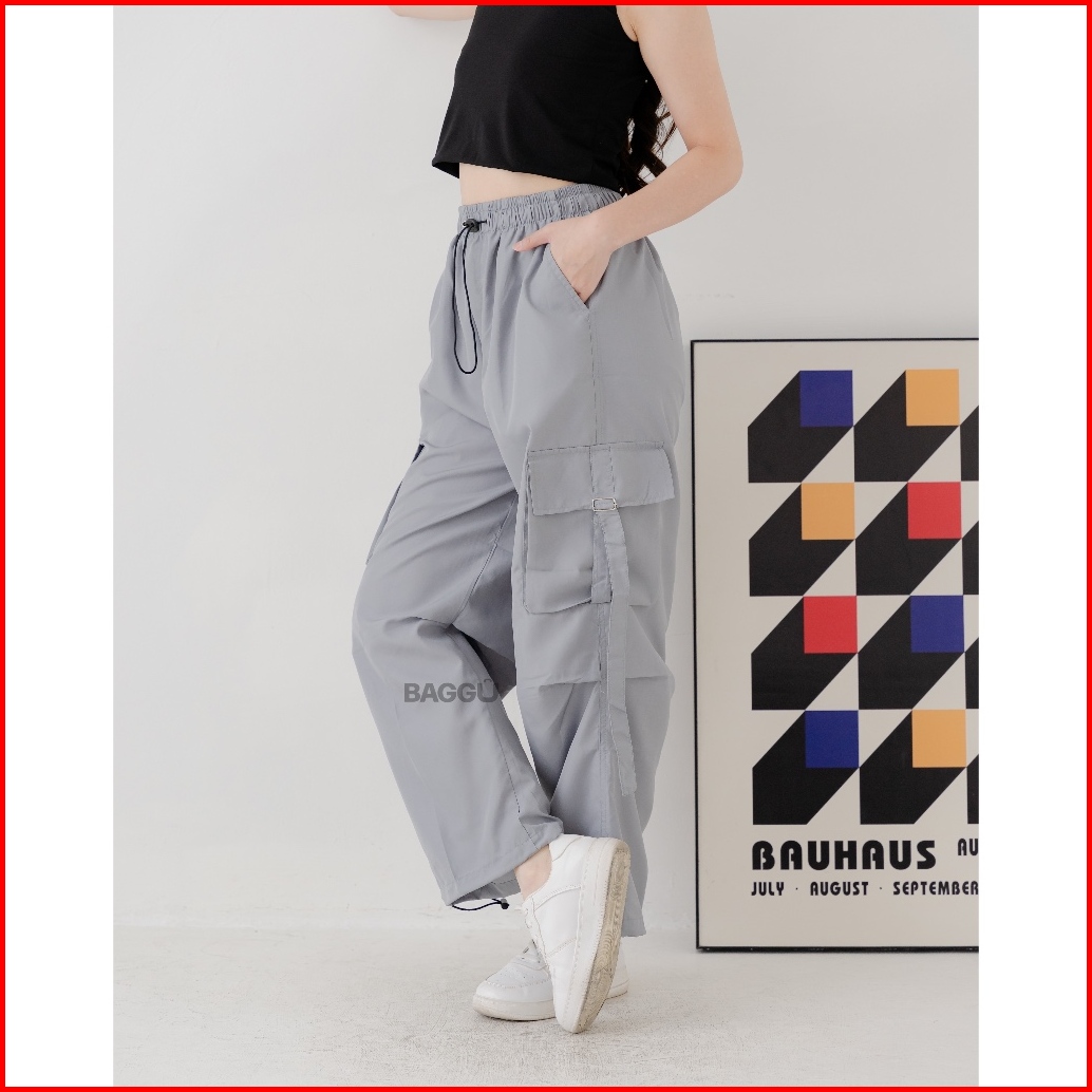 Baggu Cargo Pants Jennie - Grey - Celana Cargo Nylon Parasut Panjang Loose Pants Streetwear Korean Style Unisex