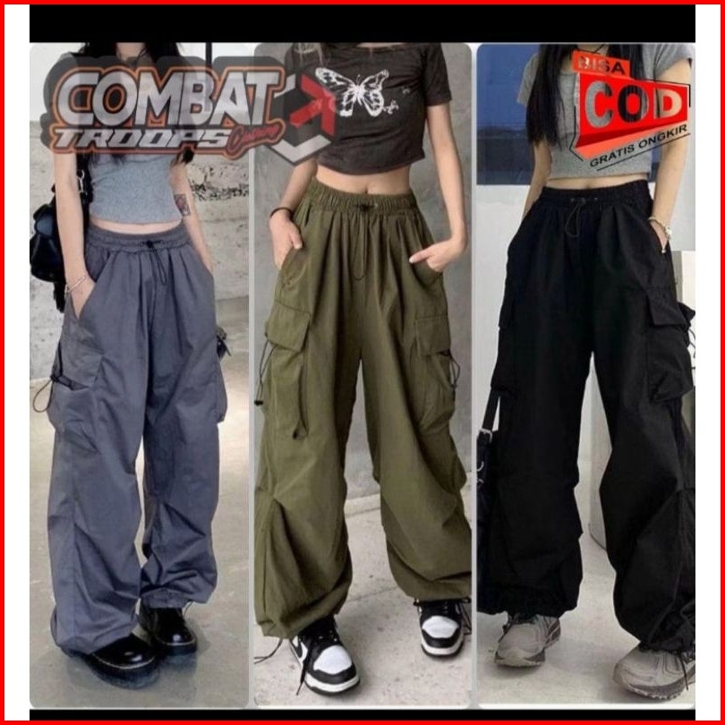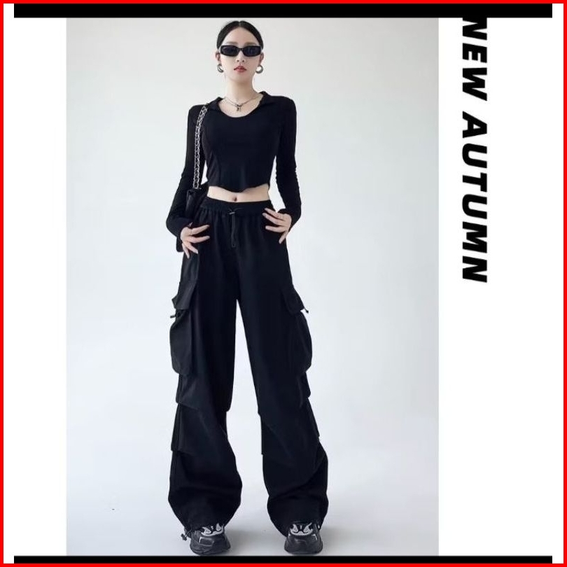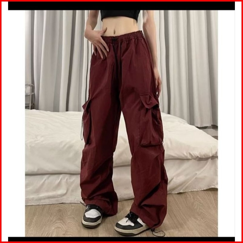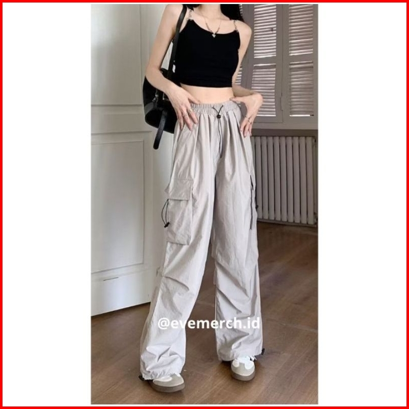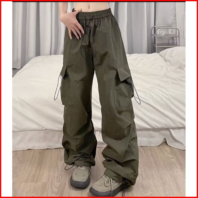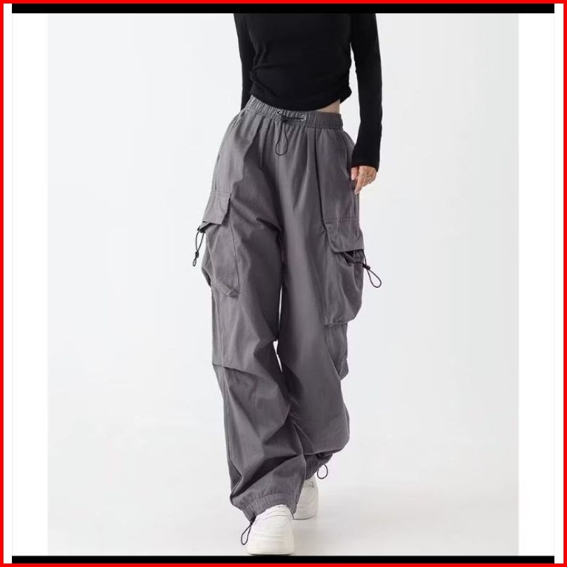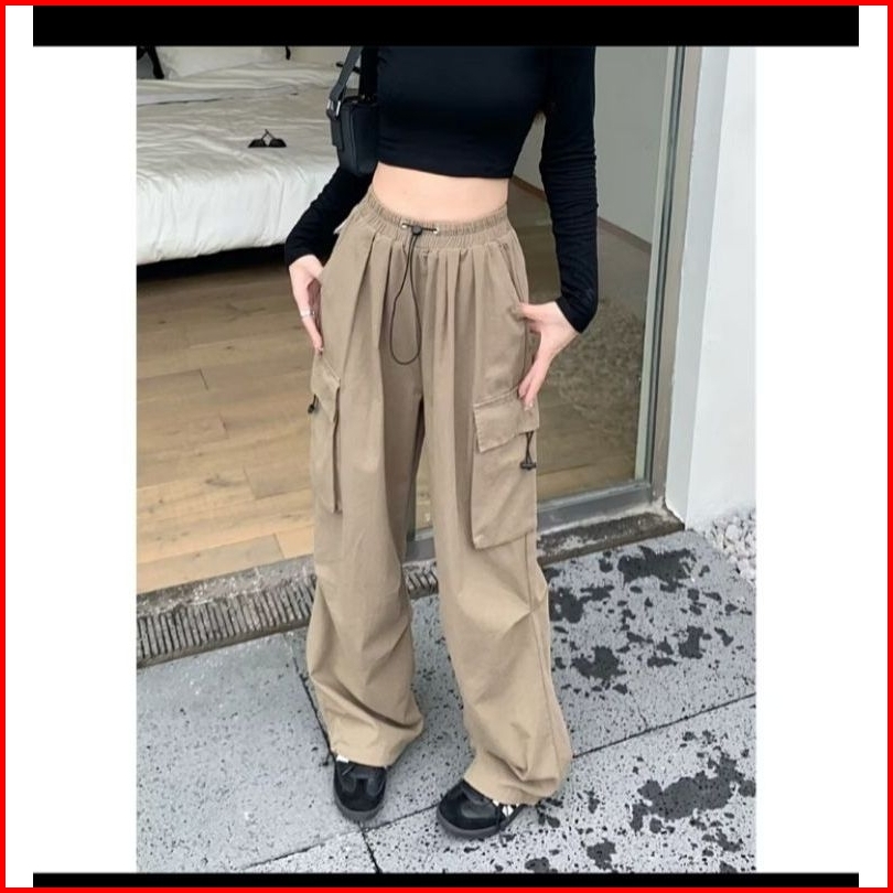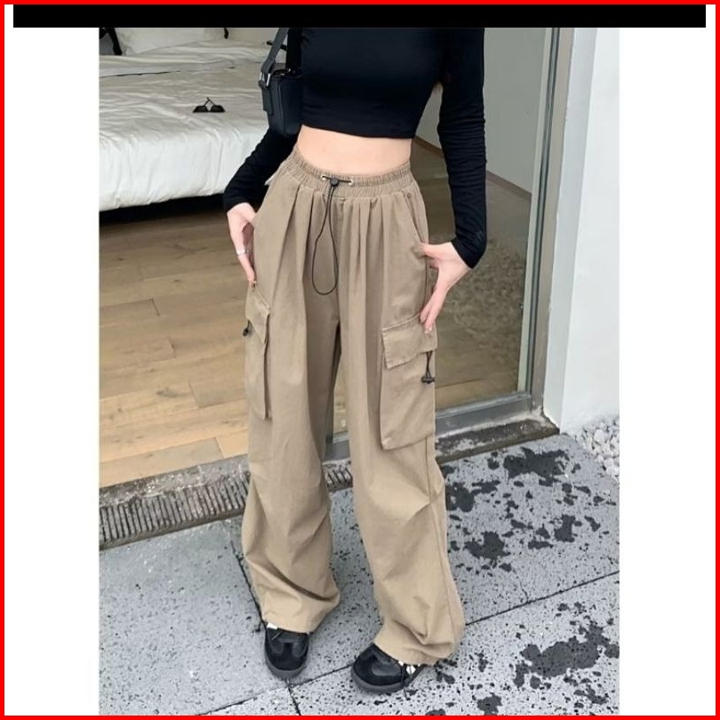 Celana Cargo Pants Wanita Serut Highwaist Loose Korean Stilish