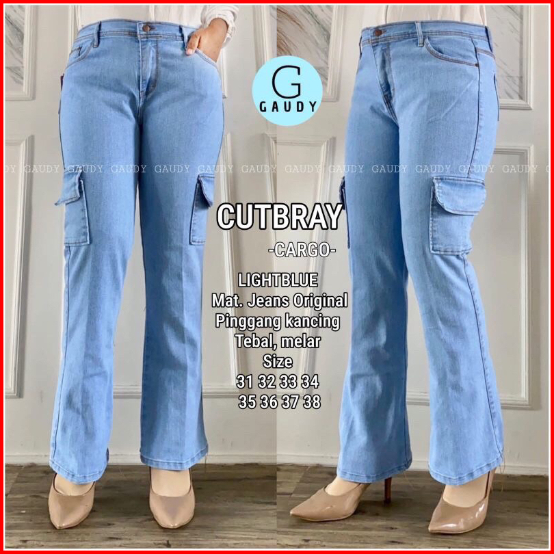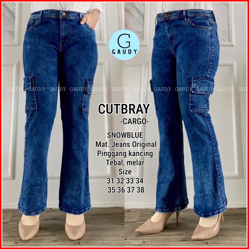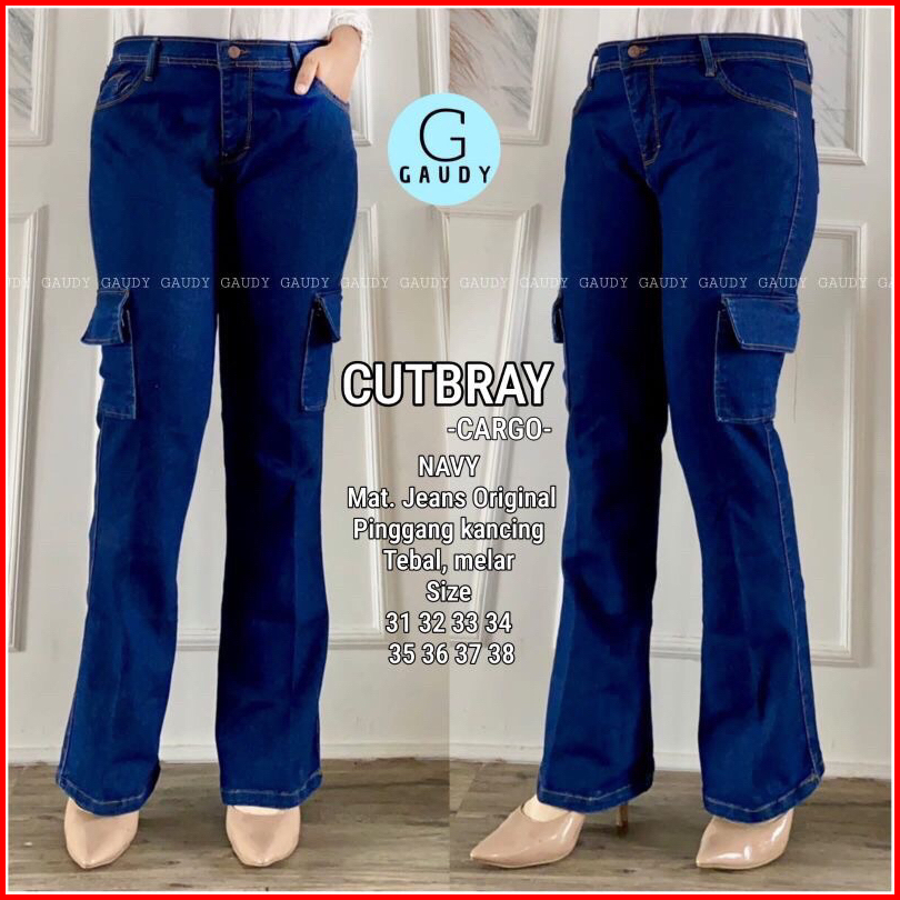 Celana Jeans Cutbray Cargo Pinggang Kancing Navy