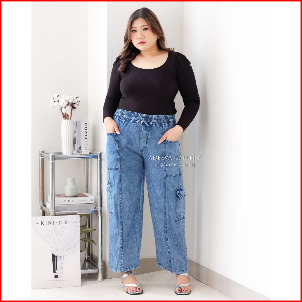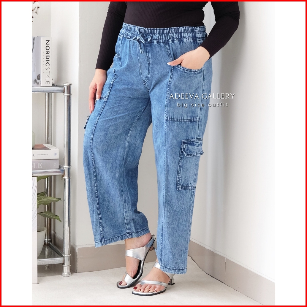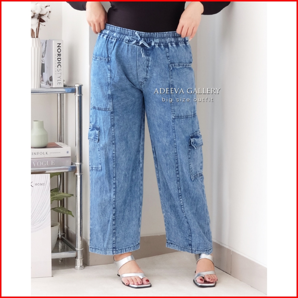 Adeeva Cargo Jeans Jumbo Wanita Bahan Denim Ringan