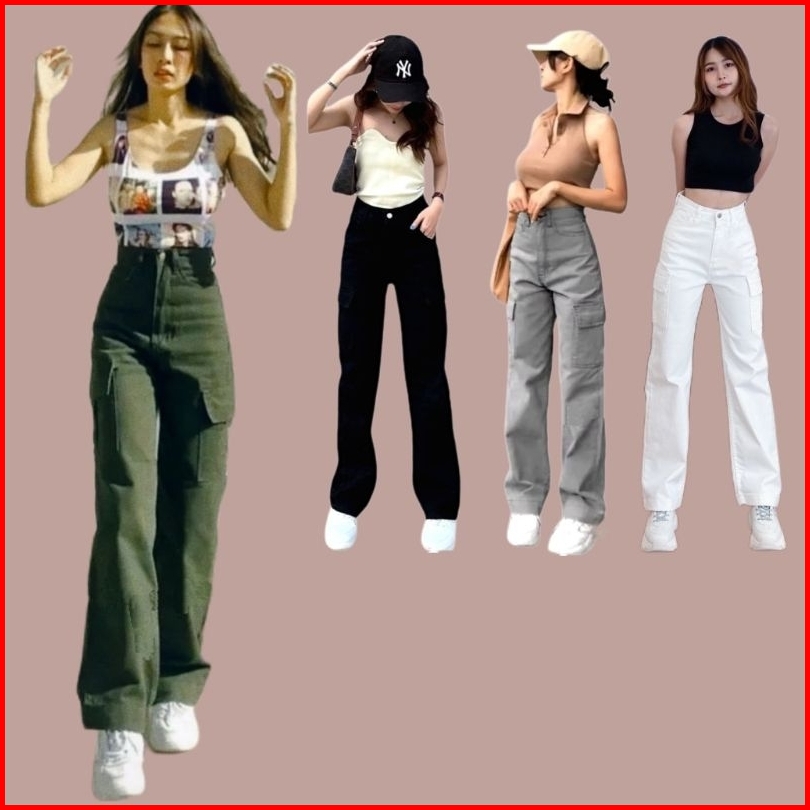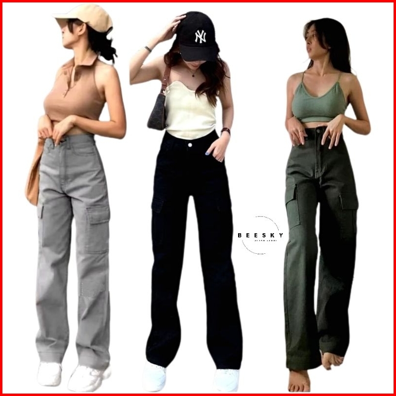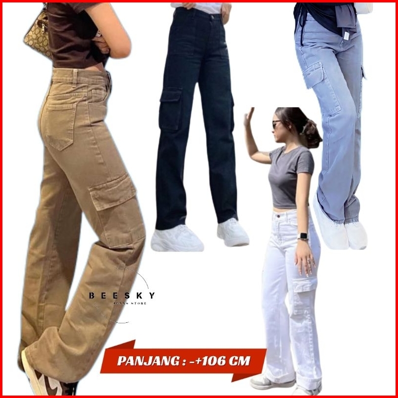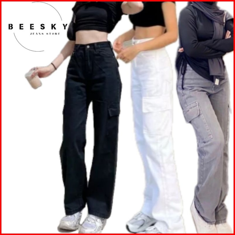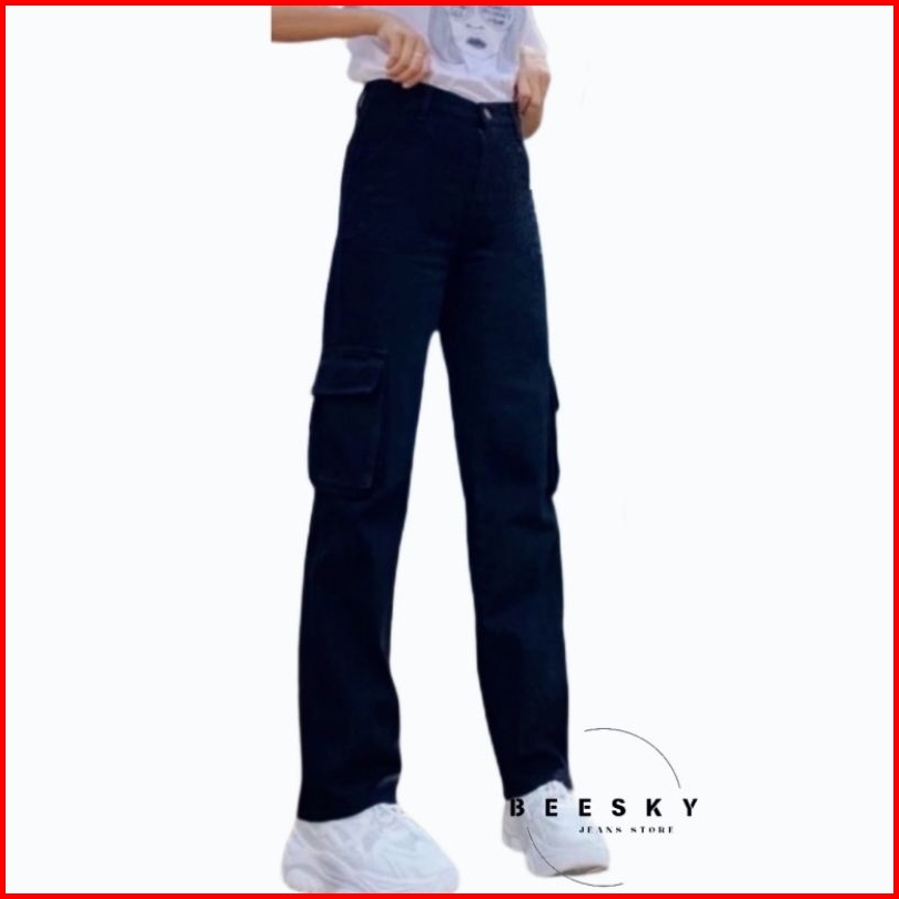 Highwast Straight Loose Cargo Celana Jeans Highwaist Panjang Wanita Denim Non Stretch